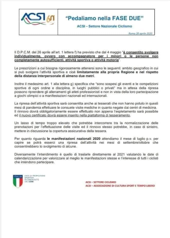 Abbiamo letto con sorpresa e con incredulità il comunicato ACSI del 28 aprile che dichiara di consentire la ripresa dell’attività sportiva dei Vostri tesserati anche senza l’acquisizione del certificato medico da rinnovare perché scaduto: il che è semplicemente contro la legge vigente.