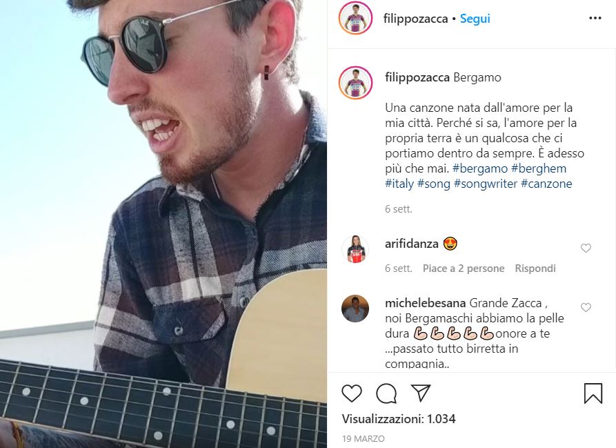 BERGAMO (BG) – Una canzone per la sua Bergamo. Il ciclista professionista bergamasco Filippo Zaccanti della Bardiani CSF Faizenè, le cui doti musicali sono note nell’ambiente, ha dedicato una bella canzone, da lui scritta, alla sua città tra le più martoriate dalla pandemia di Coronavirus.