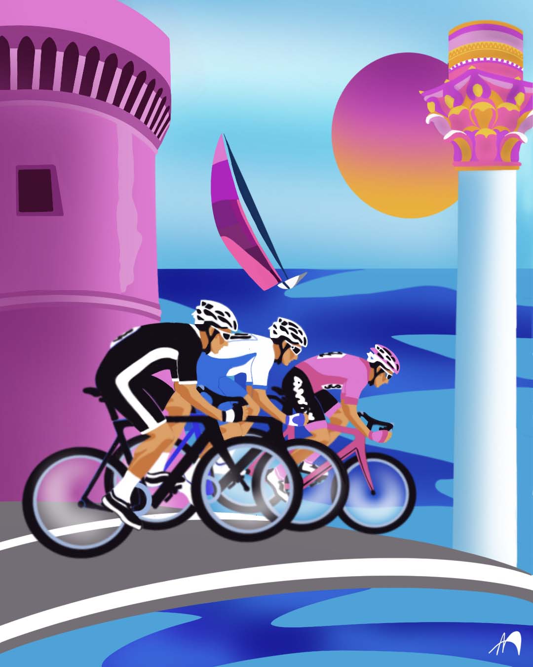 Si parte dal Castello Aragonese di Castrovillari; si arriva alle Colonne Romane di Brindisi, ci dispiace per gli altri ma è l’Italia, è il Giro. La partenza è in discesa, e dopo un lungo tratto sulla costa Ionica si arriva a Brindisi, quasi duecento chilometri di pianura. Siamo ancora a un terzo del Giro ma la tappa la precedente, Mileto-Camigliatello Silano, 223 km con la lunga salita finale per il Valico di Montescuro, è stata dura per tutti, scalatori, velocisti. Quella di oggi sarà quindi una tappa di recupero, una tappa tranquilla, a tratti noiosa. Eppure.
