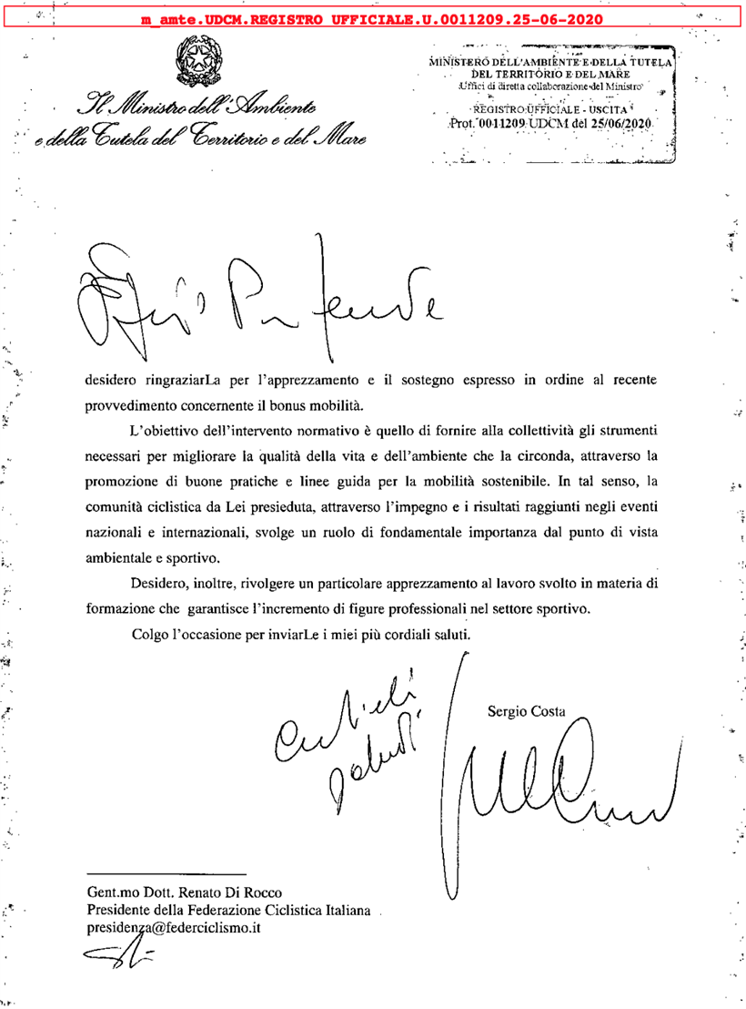 ROMA (RM) – Un importante riconoscimento per l’attività della Federazione Ciclistica giunge dal Ministro dell’Ambiente e della Tutela del Territorio e del Mare Sergio Costa, attraverso una lettera inviata ieri al presidente Renato Di Rocco:
