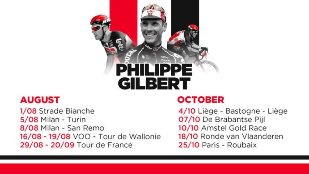 Philippe Gilbert farà poi ritorno in Belgio per partecipare al Tour de Wallonie prima di andare al Tour de France. Nel mese di ottobre il focus sarà nuovamente sulle classiche e nell’ordine disputerà Liegi-Bastogne-Liegi, Freccia del Brabante, Amstel Gold Race, Giro delle Fiandre e Parigi-Roubaix.
