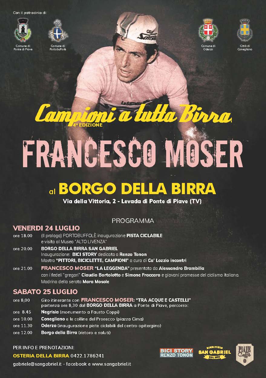 PORTOBUFFOLÈ (TV) – Il 24 e 25 luglio 2020 c’è una grande occasione per tutti gli appassionati di ciclismo: andrà in scena infatti “Francesco Moser – La Leggenda – tra il Piave e il Livenza”, manifestazione che avrà il patrocinio dei Comuni di Ponte di Piave, Portobuffolè, Oderzo e Conegliano.