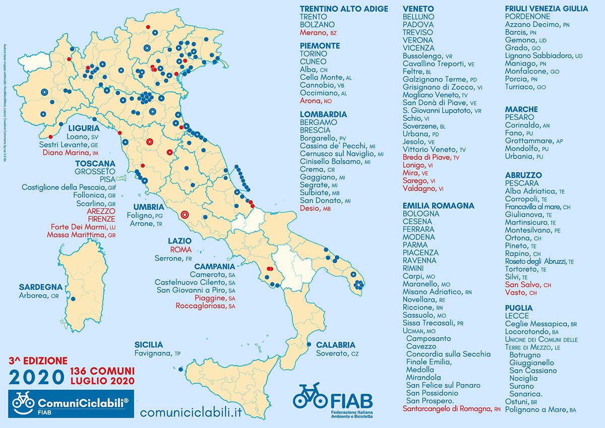 Le altre new entry del 2020 in FIAB ComuniCiclabili sono state: Roma Capitale (che ha ritirato la bandiera gialla della ciclabilità italiana a inizio luglio e che, in considerazione della estensione territoriale e della struttura policentrica, ha avuto una valutazione specifica per ognuno dei suoi 15 Municipi), Firenze, Arezzo, Desio (MB), Vasto (CH), Merano (BZ), Mira (VE), Valdagno (VI), Santarcangelo (RN), San Salvo (CH) e Breda di Piave (TV), che avevano già ricevuto il riconoscimento a fine 2019.