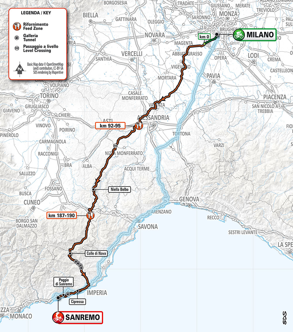 La Milano-Sanremo by Vittoria dopo 110 anni cambia percorso e incontra il mare solamente a Imperia dopo aver attraversato la Pianura Padana e gli Appennini più a occidente del consueto. Dopo la partenza da Milano si attraversa la Lomellina su strade pianeggianti, larghe e rettilinee. Dopo Alessandria la corsa attraversa il Monferrato per poi passare nelle Langhe e affrontare la prima lunga asperità di giornata, la salita di Niella Belbo. Le pendenze sono dolci, ma sono presenti, specie nella parte iniziale tratti ripidi e la salita è lunga quasi 20 km (media 3%). Dopo Ceva inizia la lunga e facile ascesa al Colle di Nava (3.9 km al 3% nel finale). Segue la veloce picchiata su Pieve di Teco seguita dal falsopiano a scendere fino a Imperia. Salita e discesa si svolgono su strade larghe. L’attraversamento di Langhe e Monferrato presenta tratti ristretti. A Imperia si rientra nel percorso classico per affrontare la Cipressa (affrontata per la prima volta nel 1982) da San Lorenzo al Mare e poco dopo il Poggio di Sanremo (affrontato per la prima volta nel 1961).