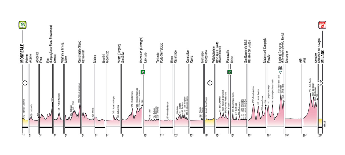 Per la prima volta la Corsa Rosa si svolgerà in ottobre (3-25). Dopo lo slittamento per la pandemia e il periodo di lock down il Giro vuole essere una cartolina di speranza e rinascita spedita dall’Italia al Mondo. Sarà la nona Grande Partenza dalla Sicilia. Il via con la cronometro individuale Monreale – Palermo di 15 km. Altre tre tappe in Sicilia e una in Calabria prima dell’arrivo a Matera da cui si ripartirà per raggiungere la Puglia. Quindi le tappe abruzzesi con la novità dell’arrivo in salita a Roccaraso dopo una frazione appenninica impegnativa, in partenza da San Salvo, che prevede oltre 4.000 metri di dislivello. Le ultime due settimane rimangono invariate rispetto a quelle già presentate tranne la partenza della tappa 10 che muoverà da Lanciano. Confermato anche il Giro-E, la E-bike experience nei giorni e sulle strade della Corsa Rosa. Si svolgerà in 20 tappe, esclusa la crono iniziale, e percorrerà i finali delle frazioni del Giro terminando proprio sotto l’arco d’arrivo dei professionisti.