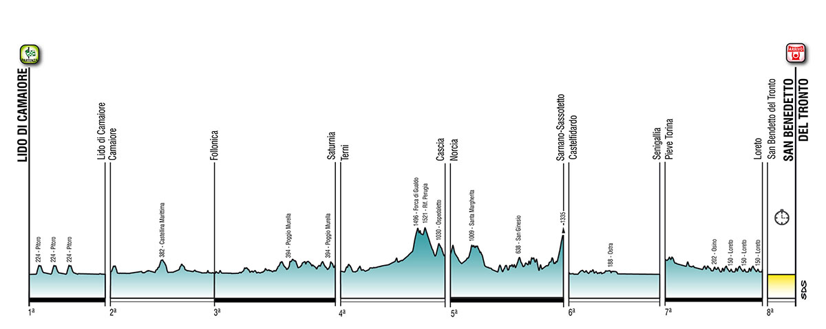 Tappa molto impegnativa con numerose salite di cui 3 classificate GPM. In partenza si scala la Forca di Ancarano (non classificata GPM) per entrare nei monti Sibillini. Dopo Visso si sale al Santuario di Macereto preceduto dallo scollinamento di Santa Margherita. Raggiunta Polverina inizia una sequenza di salite e discese che non ha attimi di respiro e/o pianura fino all’arrivo. Si scalano tra le altre le salite di San Ginesio, Gualdo e Penna San Giovanni. Il tracciato si presenta estremamente articolato sia altimetricamente che planimetricamente. Salita finale al Sassotetto da Sarnano di 14.2 km al 5.8% di media e con massime fino al 12%. Ultimi chilometri della tappa coincidono con la salita finale al Sassotetto. Si tratta di una salita dalla pendenza abbastanza costante tra il 6 e il 7% con alcuni picchi locali oltre il 10% e costituita da lunghi rettilinei intervallati da tornanti. La pendenza si addolcisce a ridosso dell’arrivo.