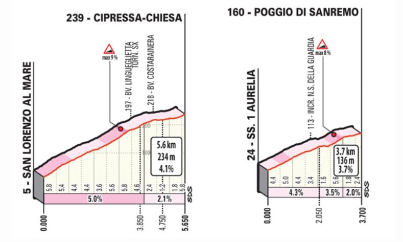 A 9 km dall’arrivo inizia la salita del Poggio di Sanremo (3,7 km a meno del 4% di pendenza media con punte dell’8% nel tratto che precede lo scollinamento). La salita presenta una carreggiata leggermente ristretta e quattro tornanti nei primi 2 km. La discesa è molto tecnica su strada asfaltata, ristretta in alcuni passaggi, con un susseguirsi di tornanti, di curve e controcurve fino all’immissione nella statale Aurelia. L’ultima parte della discesa si svolge nell’abitato di Sanremo. Ultimi 2 km su lunghi rettilinei cittadini. Da segnalare a 850 m dall’arrivo una curva a sinistra su rotatoria e ai 750 m dall’arrivo l’ultima curva che immette sul rettilineo finale di via Roma, tutto su fondo in asfalto.