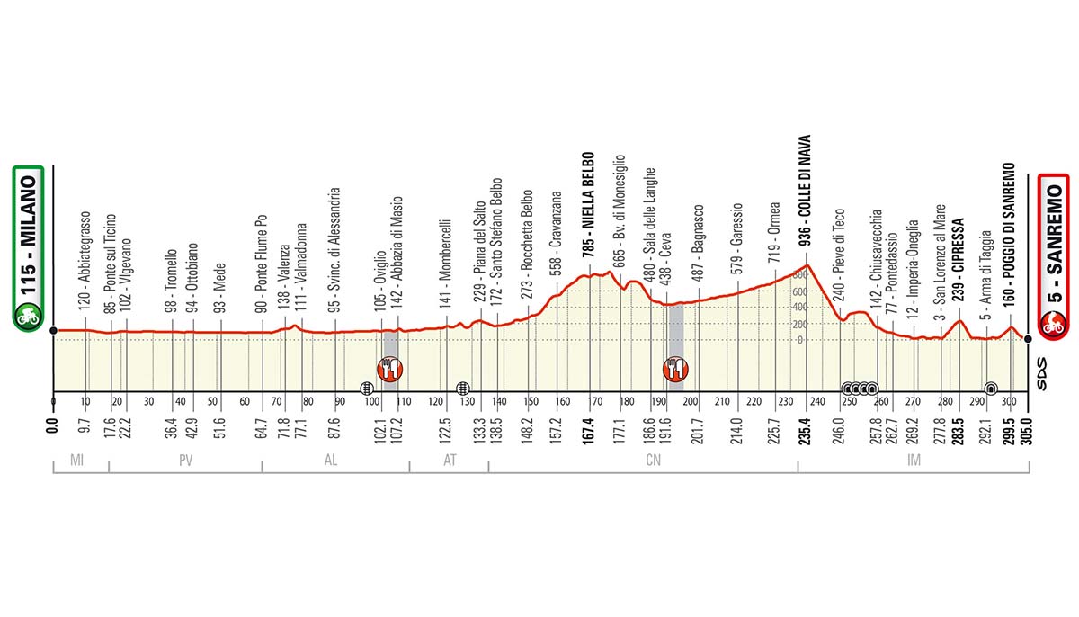 La Milano-Sanremo presented by Vittoria dopo 110 anni cambia percorso e incontra il mare solamente a Imperia dopo aver attraversato la Pianura Padana e gli Appennini più a occidente del consueto. Dopo la partenza da Milano si attraversa la Lomellina su strade pianeggianti, larghe e rettilinee. Dopo Alessandria la corsa attraversa il Monferrato per poi passare nelle Langhe e affrontare la prima lunga asperità di giornata, la salita di Niella Belbo. Le pendenze sono dolci, ma sono presenti, specie nella parte iniziale tratti ripidi e la salita è lunga quasi 20 km (media 3%). Dopo Ceva inizia la lunga e facile ascesa al Colle di Nava (3.9 km al 3% nel finale). Segue la veloce picchiata su Pieve di Teco seguita dal falsopiano a scendere fino a Imperia. Salita e discesa si svolgono su strade larghe. L’attraversamento di Langhe e Monferrato presenta tratti ristretti. A Imperia si rientra nel percorso classico per affrontare la Cipressa (affrontata per la prima volta nel 1982) da San Lorenzo al Mare e poco dopo il Poggio di Sanremo (affrontato per la prima volta nel 1961).