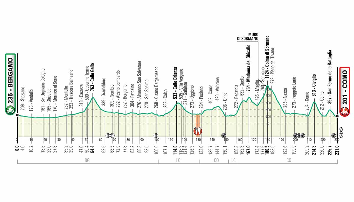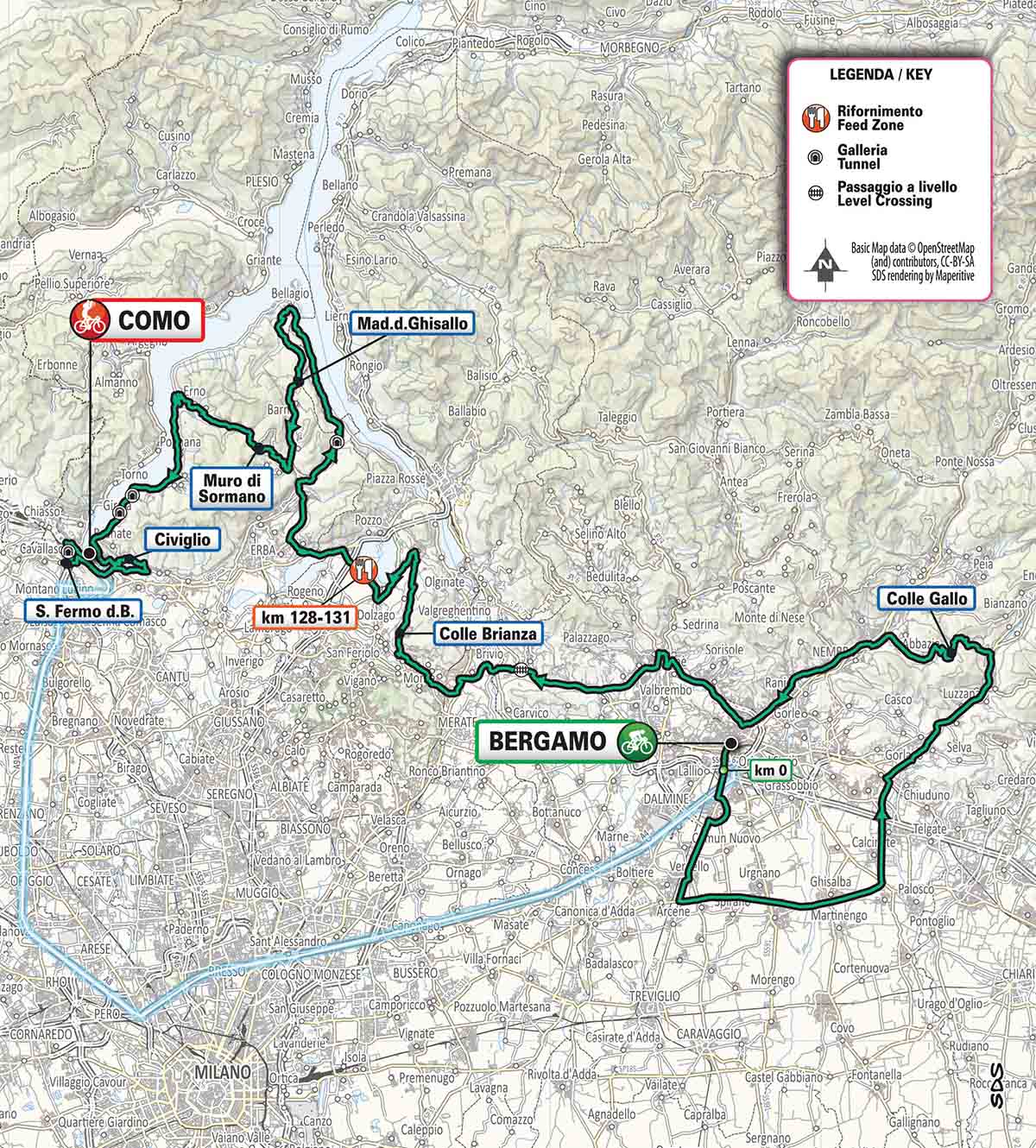 Partenza da Bergamo in direzione sud attraversando nei primi 40 km la pianura bergamasca per risalire la val Cavallina fino a Casazza dove si affronta la prima salita della corsa il Colle Gallo. Colle seguito da una discesa veloce fino a rientrare dalla val Seriana su Bergamo. Ci si immette quindi nuovamente in strade di pianura che conducono in Brianza. Passaggio breve per Colle Brianza seguito dalla discesa su Oggiono. Quindi si attraversa Pusiano, Canzo, Asso e con la discesa su Onno si arriva a Bellagio dove inizia la salita del Ghisallo. Salita con pendenze fino al 14% su strada ampia con diversi tornanti.