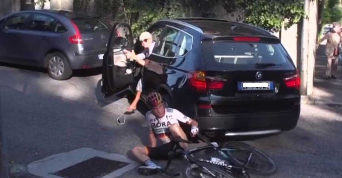 Il ciclista della Bora-hansgrohe Maximilian Schachmann è stato trascinato giù dalla macchina che, entrata nel percorso, gli si è palesata davanti verso la fine dei 231 km della gara.