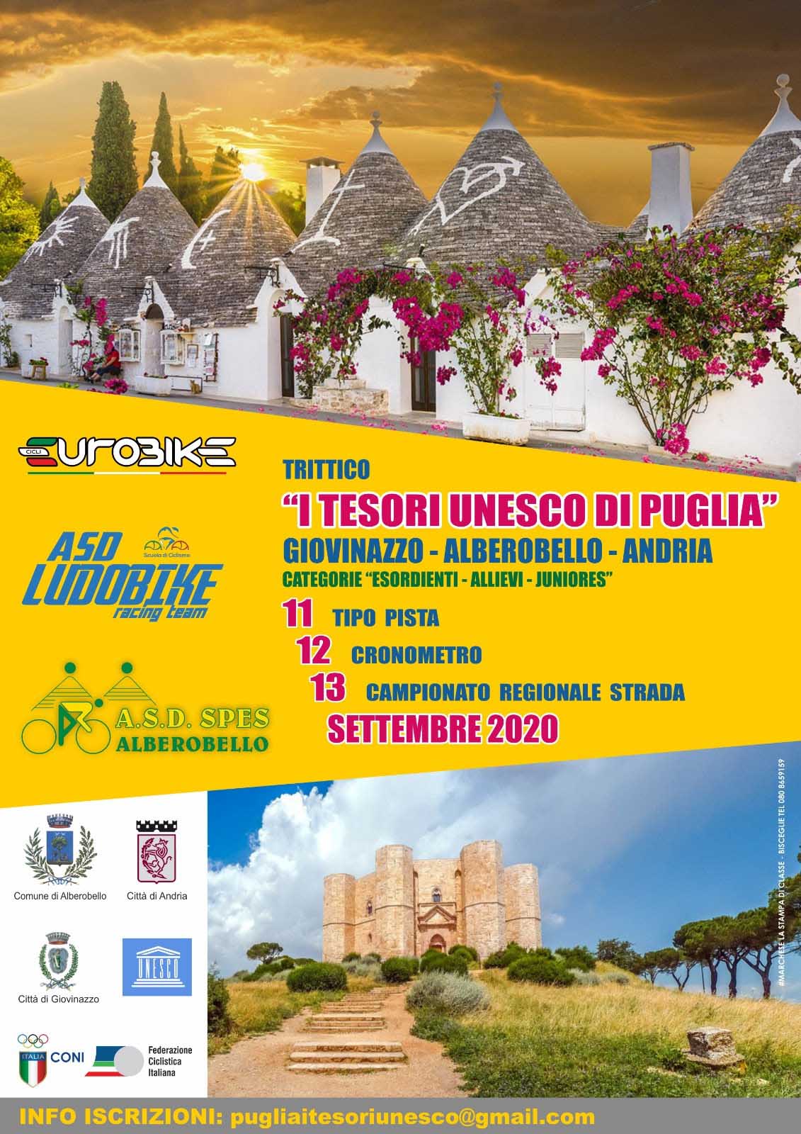 ALBEROBELLO (BA) – La stagione più anomala e complessa della storia del ciclismo agonistico pugliese è finalmente in rampa di lancio. Dopo la mountain bike tocca alla strada e la ripartenza si prospetta in grande stile, tutta dedicata alle categorie giovanili nazionali e agonistiche internazionali. Dall’11 al 13 settembre tre giorni di fuoco renderanno protagonista il Tacco d’Italia: il trittico “I tesori Unesco di Puglia” porterà infatti atleti delle categorie Esordienti, Allievi e Juniores a correre tra le meraviglie della regione del sole, Giovinazzo, Alberobello e Castel del Monte.