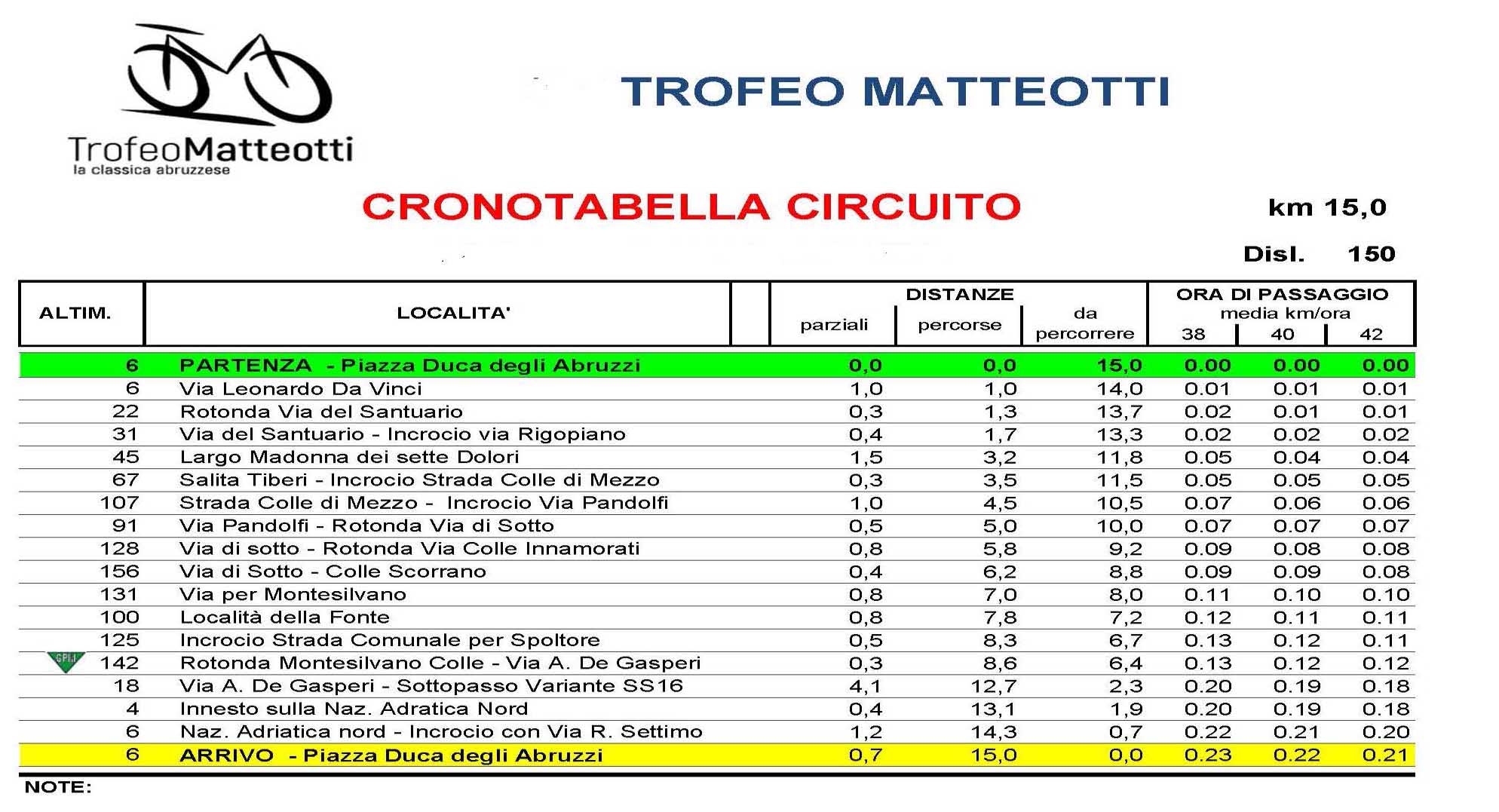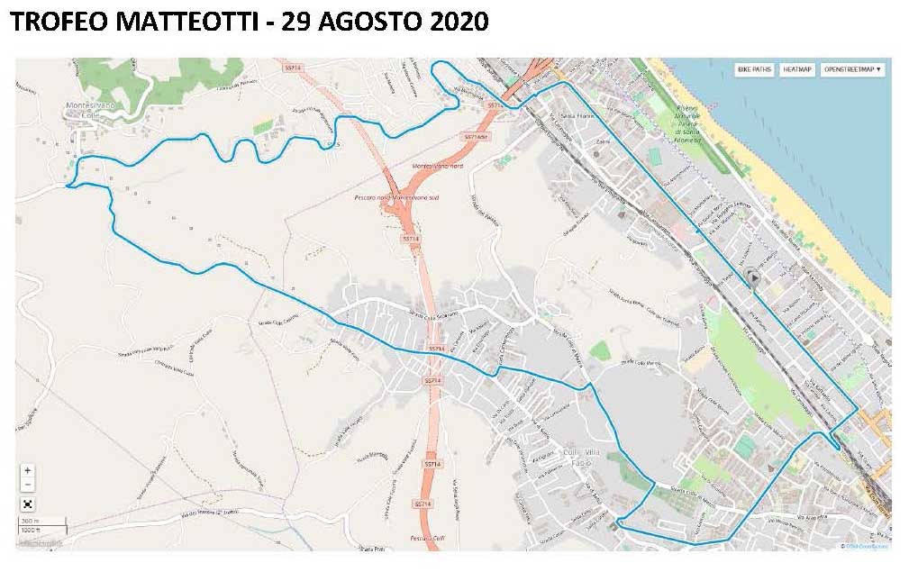 Il percorso del Matteotti 2020 resta fedele alla tradizione. Sono 195 i km in programma, costituiti da un circuito di 15 km da ripetere per 13 volte attraverso i comuni di Pescara (dove sono posti la partenza alle ore 11.15 e l’arrivo alle ore 15.30 circa, entrambe da Piazza Duca degli Abruzzi) e Montesilvano.