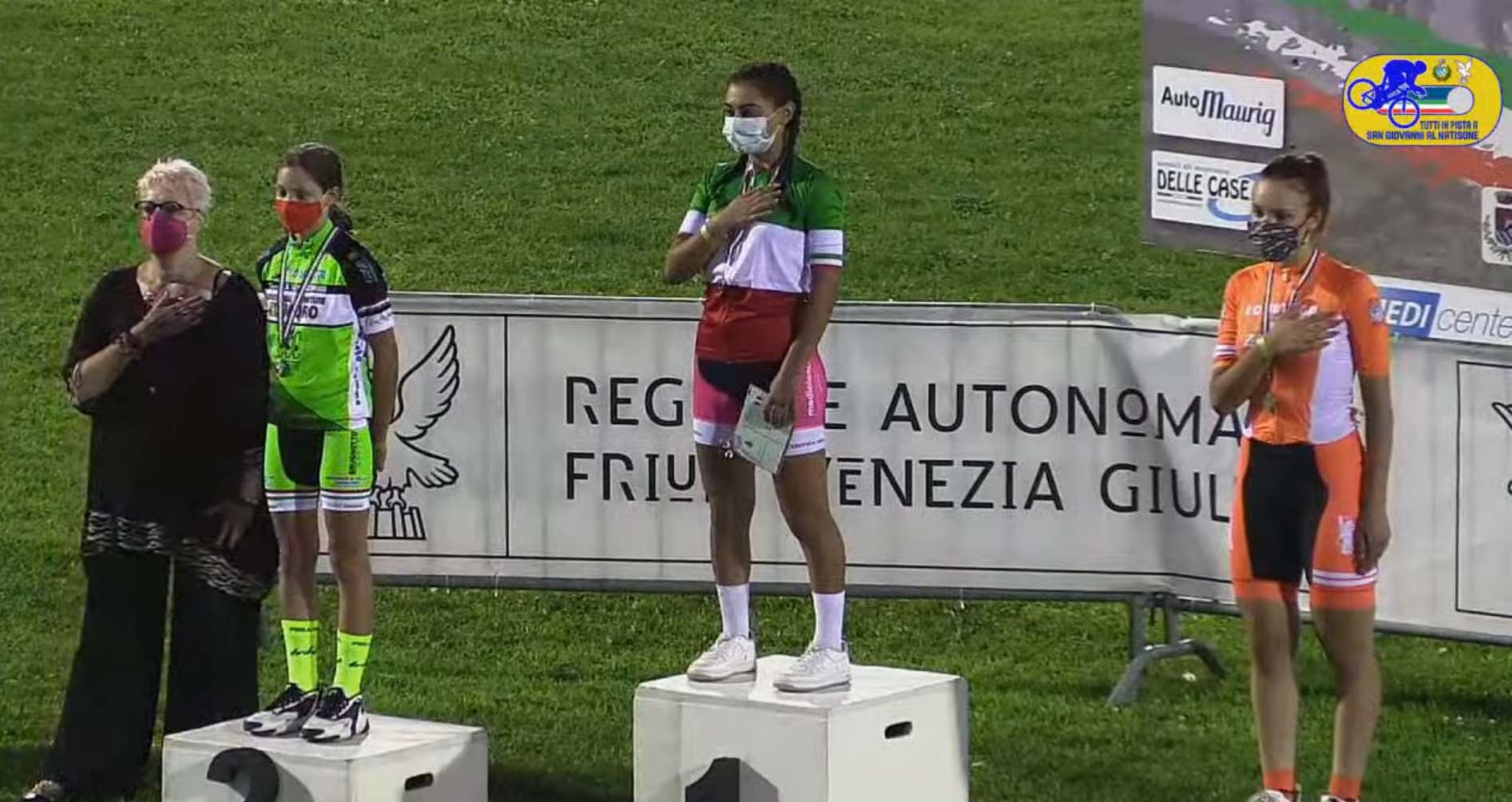 Nella corrispondente gara femminile appassionante duello tra Lucia Brillante Romeo (Liguria) e Chantal Pegolo (Friuli Venezia Giulia) che iniziano la corsa a punti con lo stesso punteggio in classifica. Nella prova finale la quattordicenne della Ciclistica Bordighera, terza sabato a Formigine, prima allunga e successivamente amministra il vantaggio che le consente di vestire la maglia tricolore. Medaglia di bronzo per la bergamasca Vittoria Pirro (Lombardia), tesserata per l’UC Ossanesga.
