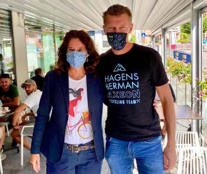 Mi rivolgo a lui e dico- Axel c ‘è la figlia di Gimondi e sarebbe bello farvi fare una foto insieme- In quel momento una signora seduta con il marito, appena sente Gimondi, si alza in piedi e mi chiede – ma è vero ? È la figlia di Gimondi ? Ed Io le rispondo, certo signora è identica, ma vedendo la sua felicità sul viso le dico anche che quello davanti a lei è il figlio di Merckx.