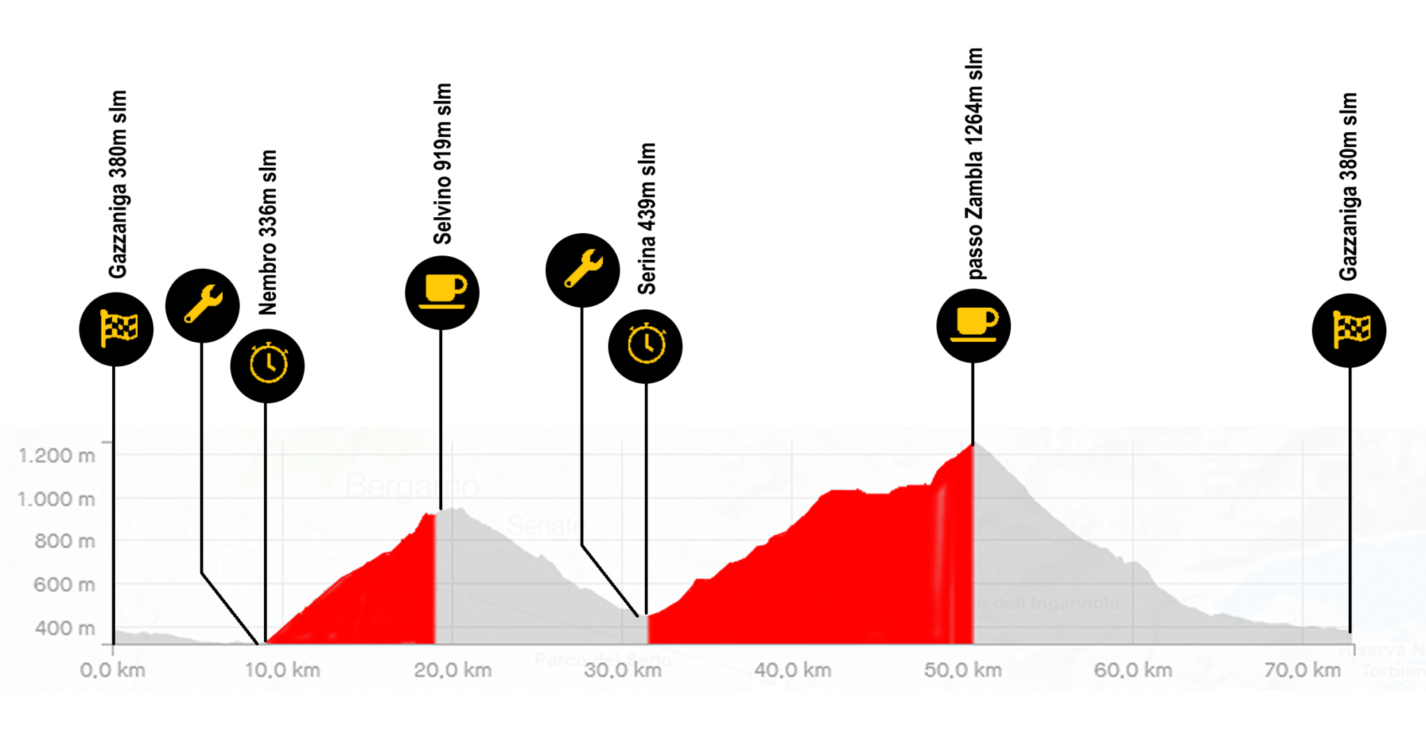 Sono due i percorsi che gli organizzatori proporranno ai partecipanti: un percorso “Kürt” (corto) di 37 km, di cui 10,5 cronometrati e 630 metri di dislivello con le salite di Selvino e passo Ganda; un percorso “Lonc” (lungo) che misura 73,4 km, di cui 29,3 cronometrati e 1.408 metri di dislivello con le salite di Selvino e passo Zambla.
