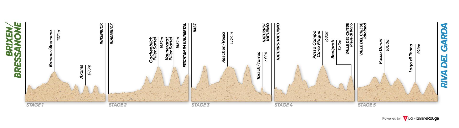Il capoluogo del Tirolo sarà sede di partenza della seconda tappa, tutta tirolese, con arrivo in salita a Feichten im Kaunertal. Imst e il Tirolo ospiteranno anche la partenza della terza tappa che riporterà la corsa in Alto Adige, con l’arrivo fissato a Naturno, da dove muoverà anche la quarta frazione in direzione Trentino, verso la Valle del Chiese e la località di Pieve di Bono.