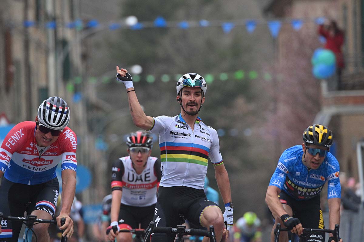 Tirreno-Adriatico: stoccata dell’iridato Julian Alaphilippe a Chiusdino. Battuti Van der Poel e Van Aert