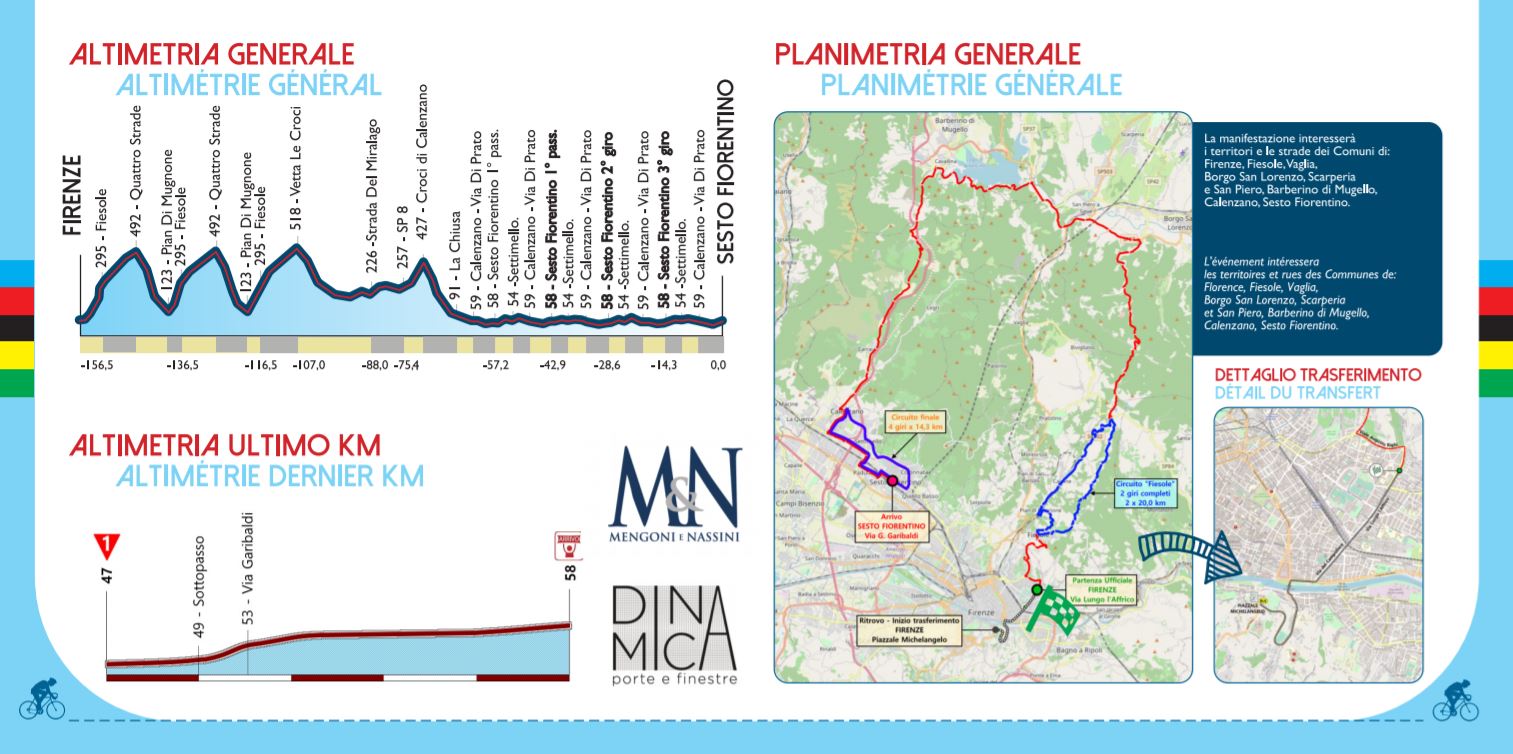 Sarà Piazzale Michelangelo, l’affascinante balcone su Firenze da cui si può ammirare uno dei panorami più belli del mondo, a dare il via alla corsa. Un breve tratto di trasferimento ad andatura controllata per superare il fiume Arno e raggiungere il “chilometro zero”. Subito dopo il via la strada salirà verso Fiesole, uno dei sobborghi più esclusivi di Firenze, e altro balcone panoramico sulla città gigliata. Pendenze costanti, non eccessivamente impegnative, ma sufficienti per stimolare attacchi fin dalle prime battute. Dopo un primo passaggio attraverso l’elegante Piazza Mino da Fiesole, si dovranno percorrere due tornate di un ampio circuito che si sviluppa sulle colline a nord di Firenze, fino a sfiorare vetta le Croci, per poi risalire a Fiesole dal versante occidentale. Terminati i due giri, si oltrepassa il Valico vetta le Croci per scendere dolcemente verso il verde Mugello. Attraverso strade ampie e leggermente ondulate, si sfiorano Borgo San Lorenzo e San Piero a Sieve, si costeggia il Lago artificiale del Bilancino e poco prima di Barberino di Mugello si riprende a salire verso le Croci di Calenzano. La salita di 4,8 km al 3,5% rappresenta l’ultima vera asperità della corsa. Una lunga discesa, su strada molto ampia, sinuosa nella prima parte e con lunghi rettilinei nella seconda, condurrà fino alla periferia di Calenzano, per poi fare ingresso nel centro abitato innestandosi nel circuito cittadino, teatro del gran finale della corsa. Successivamente si entra nel territorio comunale di Sesto Fiorentino, e dopo alcune veloci rotatorie, una curva a destra introdurrà nel lungo rettilineo finale, di circa 700 metri, per poi oltrepassare una prima volta la linea del traguardo. Da questo punto iniziano i 4 giri completi del circuito finale, che misura 14,3 km, e si sviluppa tra i comuni di Sesto Fiorentino e Calenzano; immediatamente dopo il traguardo, la corsa percorrerà Via Giusti, transitando proprio dinanzi all’abitazione di Alfredo. Il circuito non impedirà un finale ad alta velocità, anche perchè non sono presenti particolari difficoltà altimetriche, pertanto potrà consentire anche un attacco da parte di un finisseur, abile a sfruttare quei passaggi più “tecnici” presenti.