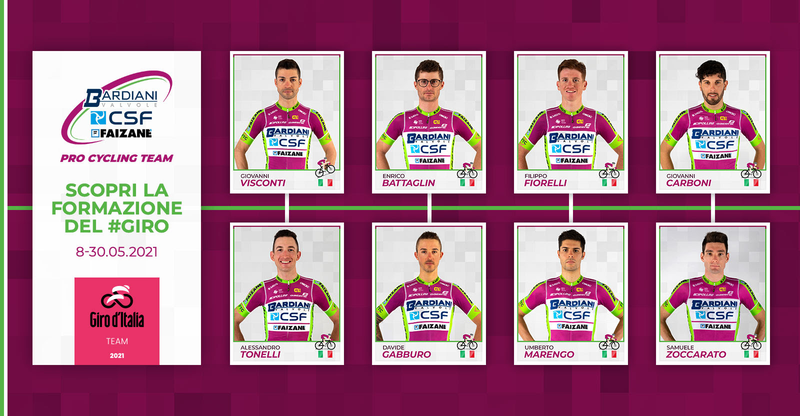 Come ogni anno non mancheranno i debuttanti. Davide Gabburo e Umberto Marengo affronteranno per la prima volta il Giro d’Italia. Davide Gabburo ha già messo a segno una vittoria in questo inizio di stagione in maglia Bardiani CSF Faizanè, mentre Umberto Marengo, atleta piemontese e residente a Torino, vivrà l’emozione del debutto proprio sulle sue strade di casa. Con loro Samuele Zoccarato, debuttante e neo-professionista, pronto a fare esperienza sulle strade del Giro d’Italia dopo un inizio di stagione nel quale ha già dimostrato le sue doti di attaccante con grande tenacia, come nella fuga intrapresa alla Strade Bianche.