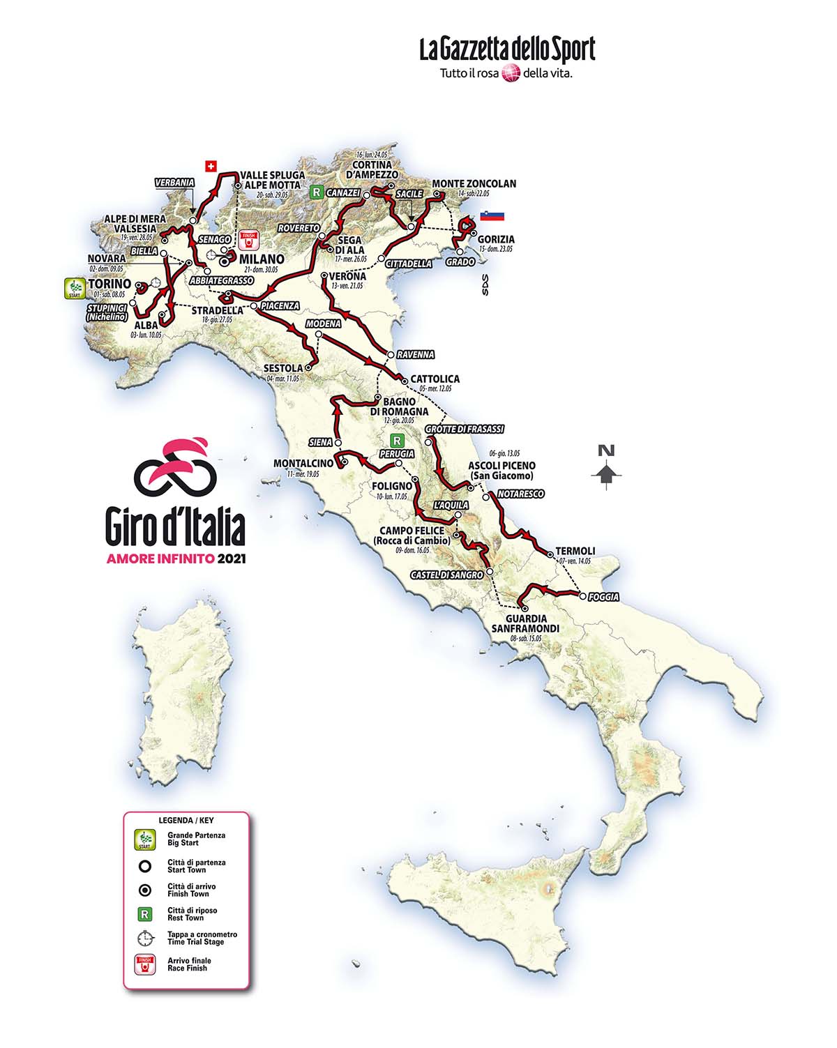 Assente il vincitore uscente, il britannico Tao Geoghegan Hart che quest’anno punterà sul Tour, il grande favorito per la vittoria finale appare essere il colombiano Egan Bernal, vincitore del Tour de France 2019. Due brevi cronometro e tanta montagna sembrano disegnare un tracciato ideale per le ambizioni di maglia rosa dello scalatore colombiano della Ineos-Grenadiers. Bernal, comunque, dovrà vedersela con avversari di spessore, tra questi il britannico Simon Yates (Bike-Exchange), vincitore della Vuelta 2018, l’esperto spagnolo Mikel Landa della Bahrein Victorius che avrà tra i suoi effettivi anche Pello Bilbao, poi il Team DSM che schiera Jai Hindley e Romain Bardet, attenzione a Joao Almeida (Deceuninck – Quick-Step), ma non sono da sottovalutare nemmeno Marc Soler (Movistar Team) ed Alexander Vlasov (Astana Premier-Tech). Saranno da valutare strada facendo le condizioni di altri due big: il nostro Vincenzo Nibali (Trek-Segafredo) che è rientrato alle corse in extremis, dopo il recente infortunio e l’operazione che avevano messo in dubbio la sua partecipazione, e Remco Evenepoel (Deceuninck – Quick-Step), che non corre dallo scorso Giro del Lombardia 2020, quanto fu vittima di un terribile incidente.