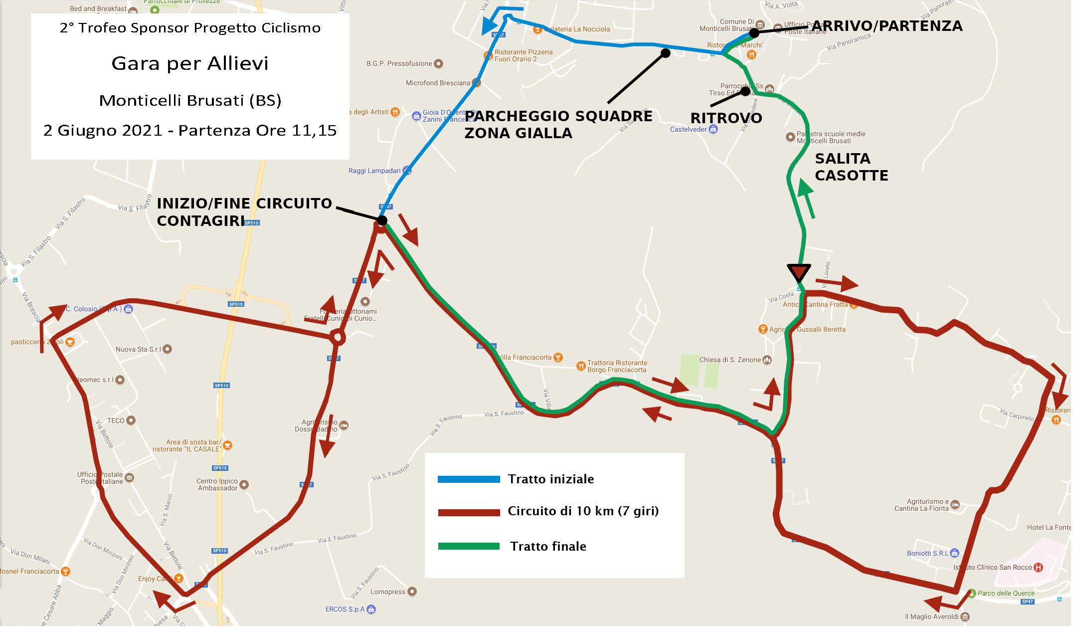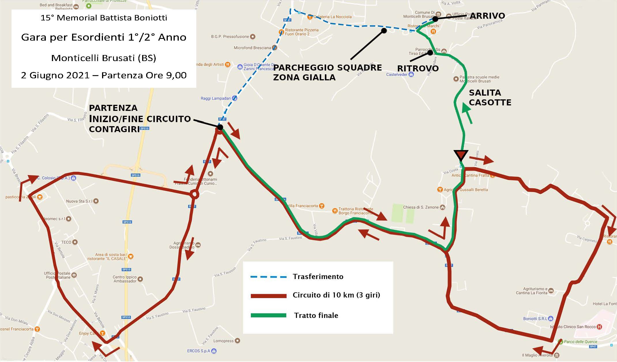 Descrizione: Monticelli Brusati (BS) Via Valle (Partenza Ufficiosa), Via IV Novembre, Via Europa (Partenza Ufficiale) indi Circuito di 3 giri di Km 10 indi Via Villa, Via S.Zenone, Via A. Manzoni (salita Casotte), Via IV Novembre, Via Valle. Percorso misto con rettilineo d’arrivo di circa 200 metri in leggera salita al 3% – 4%.