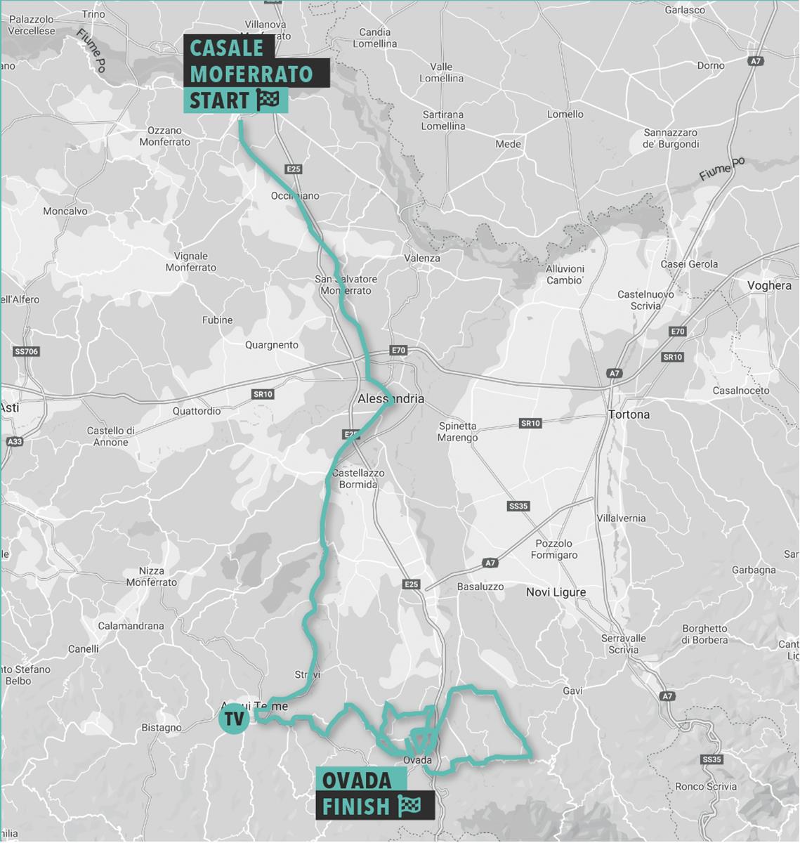 La terza tappa del Giro d’Italia Donne 2021 si articola per 135 km lungo le colline del Monferrato, un territorio dalla grande vocazione vitivinicola diventato Patrimonio Unesco nel 2014. Si parte a quota 166 m dalla capitale storica del Basso Monferrato, Casale Monferrato, toccando poi i Comuni di Mirabello Monferrato, San Salvatore Monferrato e Castelletto Monferrato per arrivare ad Alessandria, comune più esteso del Piemonte che custodisce, sulla riva del Tanaro, una delle più grandi fortezze militari d’Europa ancora intatte. Si prosegue verso Acqui Terme, nell’Alto Monferrato, rinomata per il Bracchetto d’Acqui e le sue acque termali, dove il percorso inizia a farsi più impegnativo con una serie di saliscendi tra Belforte Monferrato e Tagliolo Monferrato, situati nella valle dello Stura, e il comune di Mornese, appartenente al Parco Regionale delle Capanne di Marcarolo. Le salite terminano a Ovada, una cittadina caratterizzata da un’impronta tipicamente ligure.
