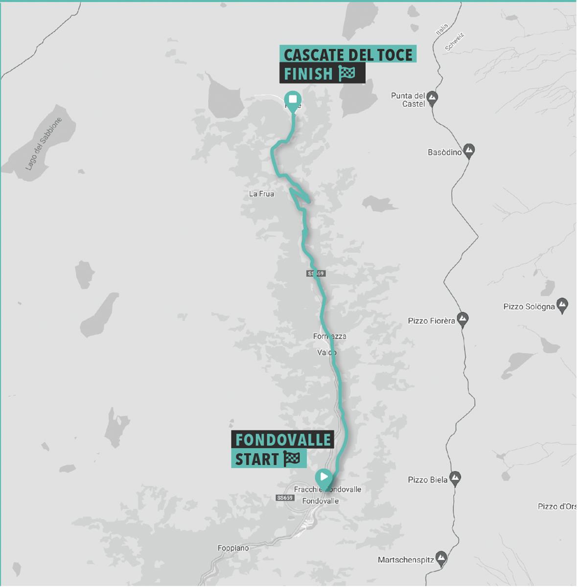La quarta tappa chiude la parentesi piemontese del Giro d’Italia Donne 2021, un’intensa Cronometro Individuale lunga appena 11,2 km, ma con un dislivello di oltre 500 m e che raggiunge quota 1.714 m (Cima Coppi). La gara si svolge interamente nel comune di Formazza, partendo dalla frazione di Fondovalle a quota 1.210 m, per poi toccare le località di Valdo, alla confluenza tra il Toce e il torrente Vannino, Brendo, dove la valle si restringe e si fa più ripida, e la Cascata del Toce, a quota 1.680 m, una delle cascate più spettacolari delle Alpi con un salto di 143 metri. Il traguardo è a Riale, la frazione più settentrionale del Piemonte, uno tra i primi insediamenti creati dalle popolazioni Walser, oggi sovrastata dall’imponente diga di Morasco. Questo tratto fu percorso nel 2003 dalla diciannovesima tappa del Giro d’Italia maschile, ultimo assolo della carriera di Marco Pantani.