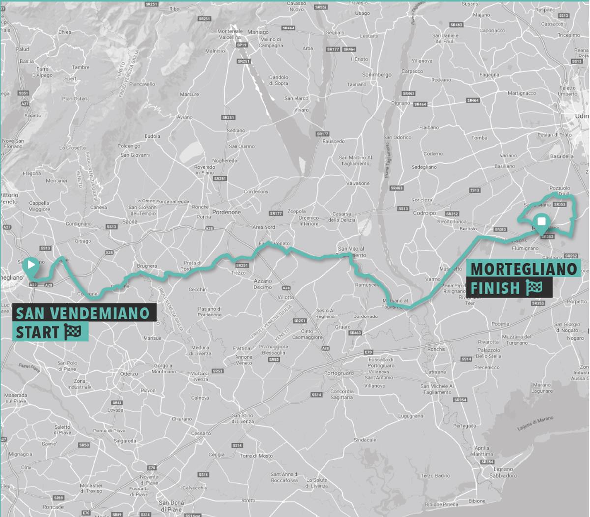 L’ottava tappa è l’unica del Giro d’Italia Donne 2021 che attraversa due regioni, iniziando dal Veneto e arrivando in Friuli Venezia Giulia con un percorso di 130 km. Le atlete partono da San Vendemiano (TV), Comune confinante con Conegliano, proprio sotto le colline del Prosecco, dichiarate Patrimonio Unesco, per proseguire attraversando i palü, paesaggio naturale con aree acquitrinose, e toccando i paesi di San Fior e Codognè. All’altezza di Brugnera, la tappa si sposta in Friuli Venezia Giulia dove intercetta anche i comuni di Prata di Pordenone, Azzano Decimo, Fiume Veneto, San Vito al Tagliamento e Sesto al Reghena, oltre che i fiumi Livenza e il Tagliamento. La gara si conclude in provincia di Udine con due giri di un circuito che attraversa i comuni di Talmassons, Bicinicco, Lestizza e, meta finale, Mortegliano.
