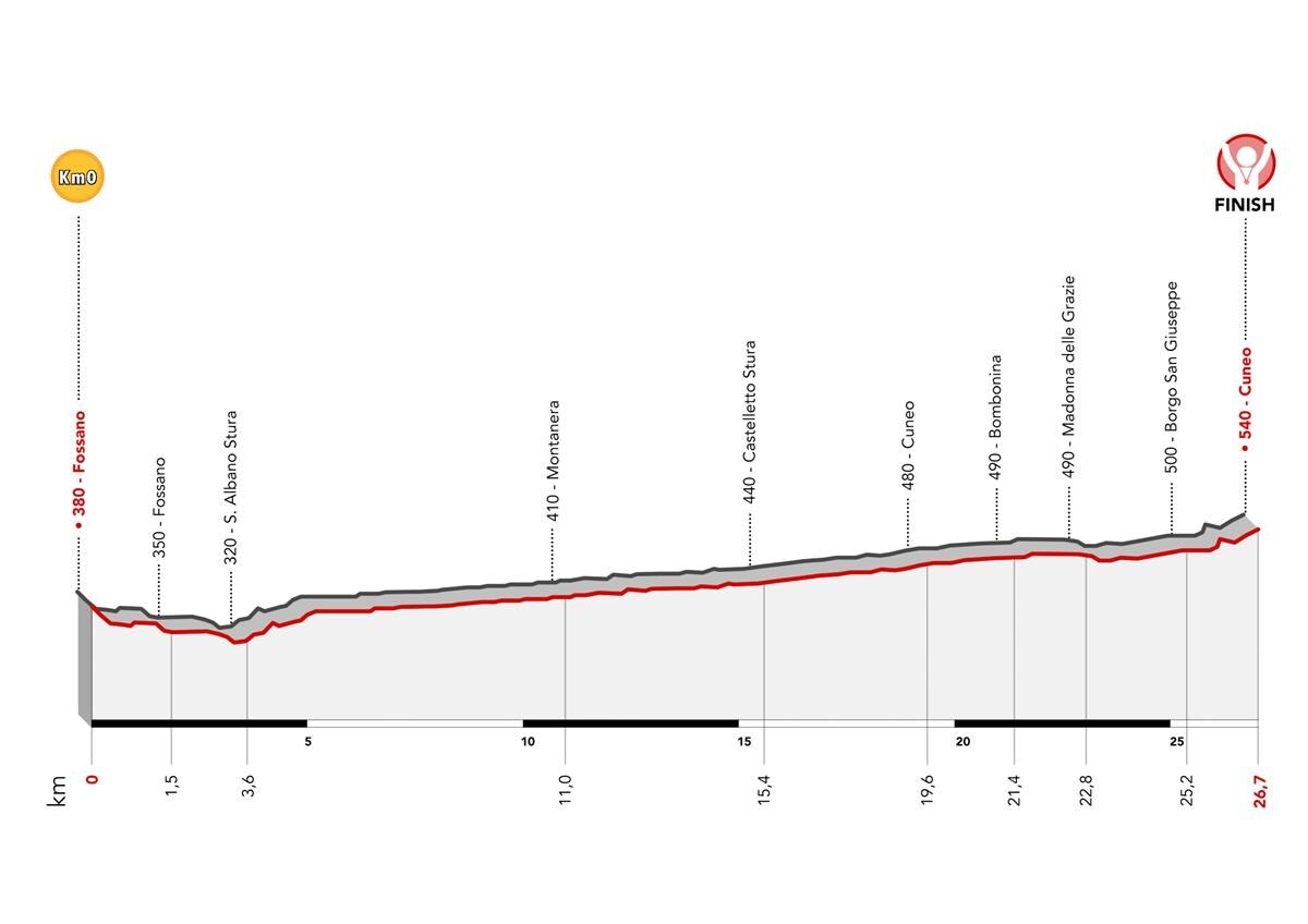 Il Giro d’Italia Donne 2021 si apre in provincia di Cuneo con una Cronometro a Squadre con partenza dal centro di Fossano, una tappa che costeggia Stura di Demonte, fiume che segna insieme al torrente Gesso i limiti della città di Cuneo, meta della gara, attraversando i paesi di Sant’Albano Stura, Montanera, Castelletto Stura. La tappa parte da quota 380 metri fino ad arrivare a 540 metri.
