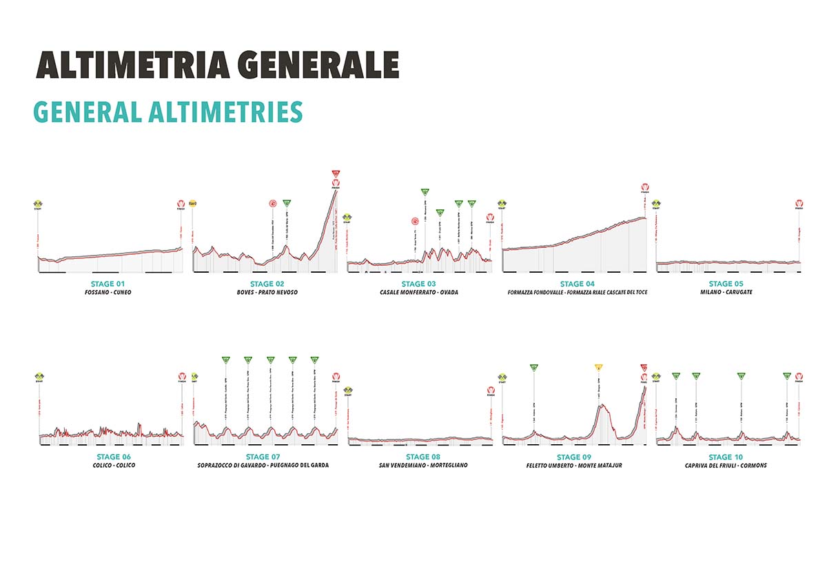 Per 10 giorni il Giro percorrerà il Nord Italia, da ovest verso est, toccando Piemonte, Lombardia, Veneto e Friuli Venezia Giulia con le loro bellezze naturalistiche, artistiche e storiche, in un percorso lungo 1.022 km attraverso oltre 130 Comuni in 10 emozionanti e impegnative sfide per la conquista della prestigiosa Maglia Rosa 2021. Inaugura la competizione una serrata cronosquadre da Fossano a Cuneo per poi nella seconda tappa inerpicarsi con un dislivello di oltre 1.000 metri da Boves alla famosa stazione sciistica di Prato Nevoso a quota 1.607 nel Piemonte Orientale; il giorno successivo è il turno di un percorso di 135 km lungo le colline dalla grande tradizione vitivinicola, da Casale Monferrato fino a Ovada, per poi lasciare il Piemonte il 5 luglio con un’impegnativa crono individuale che da Fondovalle di Formazza sale fino a quota 1.714 metri alla Cascata del Toce, massima quota di questa edizione. Tre le tappe lombarde: si parte con una passerella nel centro di Milano, da Piazza Affari al Duomo, per poi attraversare per 120 km la Martesana e la bassa Brianza fino a Carugate; la sfida successiva si sviluppa lungo tutto il Lago di Como per una lunghezza record di 155 km con Colico come punto di partenza e arrivo; si termina l’8 luglio con un percorso di 110 km in provincia di Brescia, da Soprazzocco di Gavardo a Puegnago del Garda. L’ottava tappa è l’unica che attraversa due Regioni, 130 km da San Vendemiano in Veneto a Mortegliano in Friuli Venezia Giulia, dove si terranno le ultime due gare: una di 120 km da Feletto Umberto al Monte Matajur, col maggior dislivello di quest’anno tra partenza e arrivo, 1.124 m, e il gran finale di 113 km da Capriva del Friuli a Cormòns, toccando anche Gorizia.