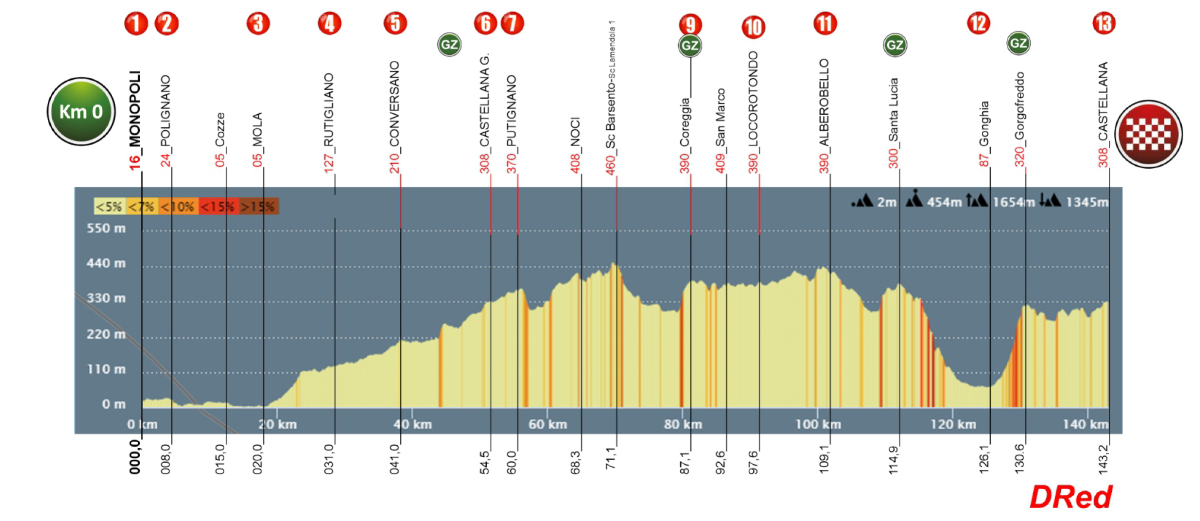 La prima vera salita di giornata arriva alla progressiva chilometrica 83: 1,5 km al 9% di pendenza media per mettersi alle spalle “Il Guaguino di Coreggia” (frazione di Alberobello). Ma occhio, allo scollinamento non c’è discesa, (un elemento comune dopo quasi tutte le salite) ma altri tratti irregolari che renderanno la vita difficile a chi ha perso le ruote dei migliori in salita. Coreggia introduce nel cuore della Valle d’Itria, caratterizzata dai pinnacoli bianchi che si ergono nelle campagne. Al km 92 si arriva nel centro di San Marco, frazione di Locorotondo, dove è posto un traguardo volante con in palio eccellenze dei prodotti tipici locali. Al km 100 si transita in Locorotondo, centro storico tra i borghi più belli d’Italia. Si imbocca la SS. 172 e la corsa punta dritto verso la capitale dei trulli: Alberobello che si raggiunge al km 109. Stesso circuito cittadino dell’arrivo di tappa del Giro d’Italia 2017 e si ridiscende verso la vallata del canale di Pirro. Non c’è un attimo di respiro: al km 115, si attacca il “muro” di Santa Lucia ai monti, 800 metri al 12%, seguono 7 km di “mangia e bevi” prima di affrontare la prima ed unica vera discesa di giornata: la Francisto Mare, strada panoramica che riporta improvvisamente le atlete ad intravedere l’azzurro dell’Adriatico. Un attimo prima di raggiungere il mare una svolta secca a sinistra riporta il plotone con il naso all’insù, verso l’arrivo di Castellana Grotte. É in questo punto, ai meno 15 km dall’arrivo, che si affronta la salita più dura di giornata e che verosimilmente si rivelerà decisiva per l’esito della corsa. È l’ascesa di Gorgo Freddo, 2,5 km con media al 9% e punte al 12%. Anche il fattore ambientale qui può essere decisivo, goliardicamente a dispetto del nome, se dovesse esserci caldo questa salita potrebbe trasformarsi in una fornace e al culmine – ormai lo si è capito -non c’è discesa per recuperare, ma ancora saliscendi che porteranno all’arrivo di Castellana Grotte. Dallo scollinamento sino al centro urbano di Castellana la Sp 146 ha un andamento molto nervoso sia in altimetria che in planimetria, con fitto susseguirsi di curve, dossi e controcurve che fanno perdere ben presto il contatto visivo. Ultimi 2 km da affrontare con attenzione nel centro abitato con alcune strade strette prima di imboccare il largo viale dell’ultimo km che porterà all’arrivo del piazzale Franco Anelli scopritore del famoso centro carsico. Mini rotatoria al triangolo rosso dell’ultimo km, poi lieve ascesa al 5% che si interrompe con la curva larga a destra. Altra rotatoria (350 m), questa volta molto ampia, seguita da un restringimento della sede stradale (isola di traffico sulla destra) e curva secca a sinistra (220 m) per imboccare via Grotte, sede dell’arrivo. Rettifilo d’arrivo in impercettibile discesa, lungo 200 con una leggera piega a sinistra. Sede stradale larga 6 metri, fondo buono.