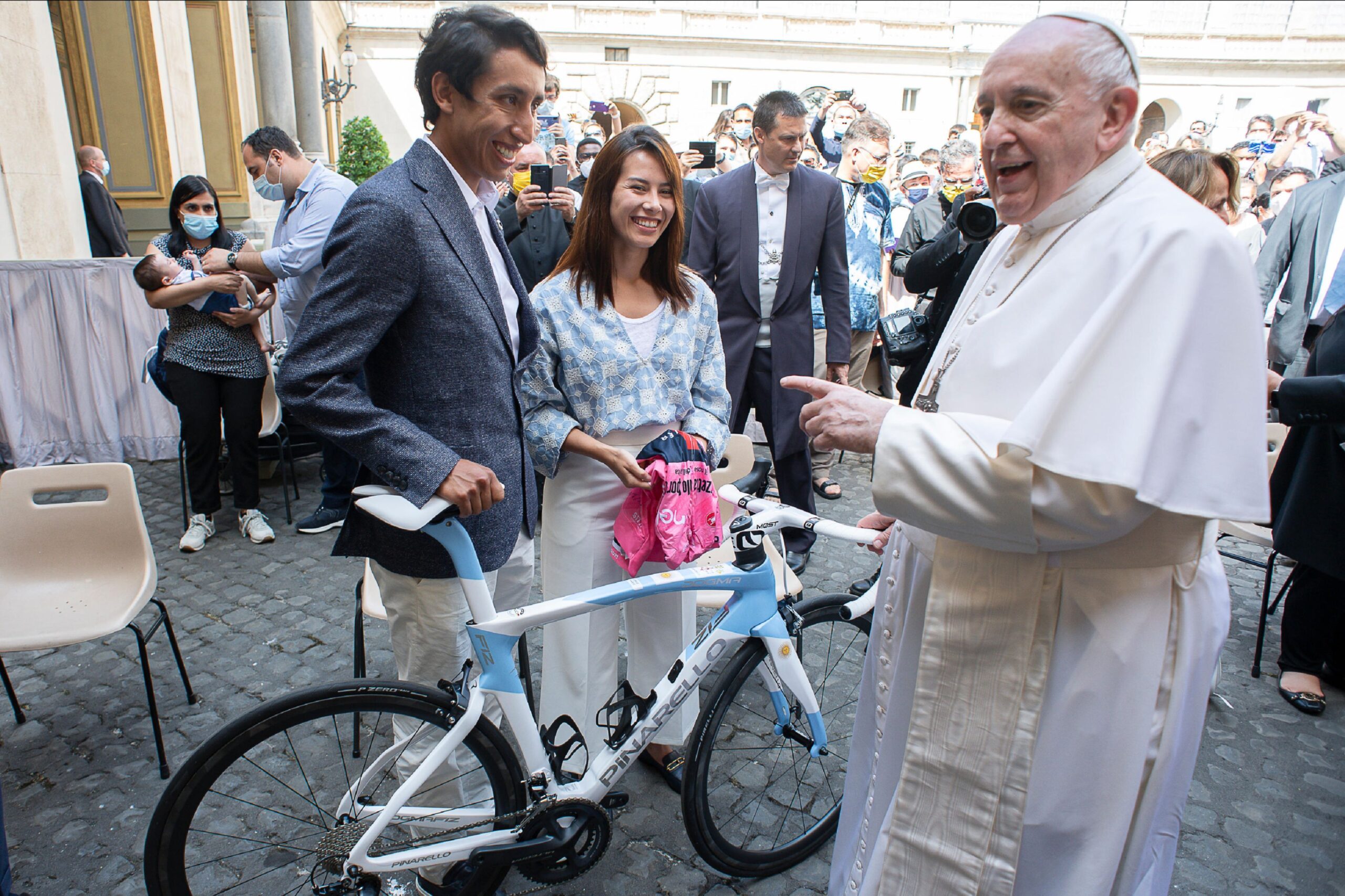 Per mostrare la sua gratitudine a Papa Francesco, e seguendo il consueto protocollo di offrire un regalo, Bernal porta la sua Maglia Rosa e una bicicletta Pinarello Dogma F12 dipinta su misura come gesto simbolico all’uomo che è capo della chiesa cattolica.