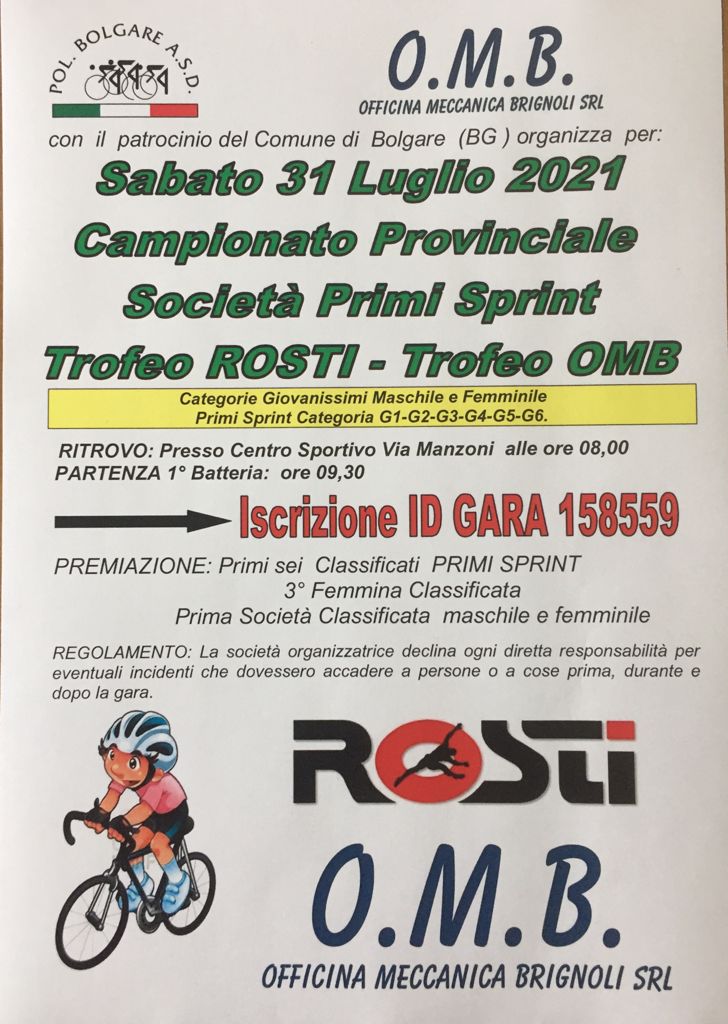 BOLGARE (BG) – Sabato 31 luglio sulla pista del centro sportivo di Bolgare (Bg) torneranno di scena i Giovanissimi per il Gran Premio Rosti – Trofeo OMB valido per il Campionato Provinciale Primi Sprint.