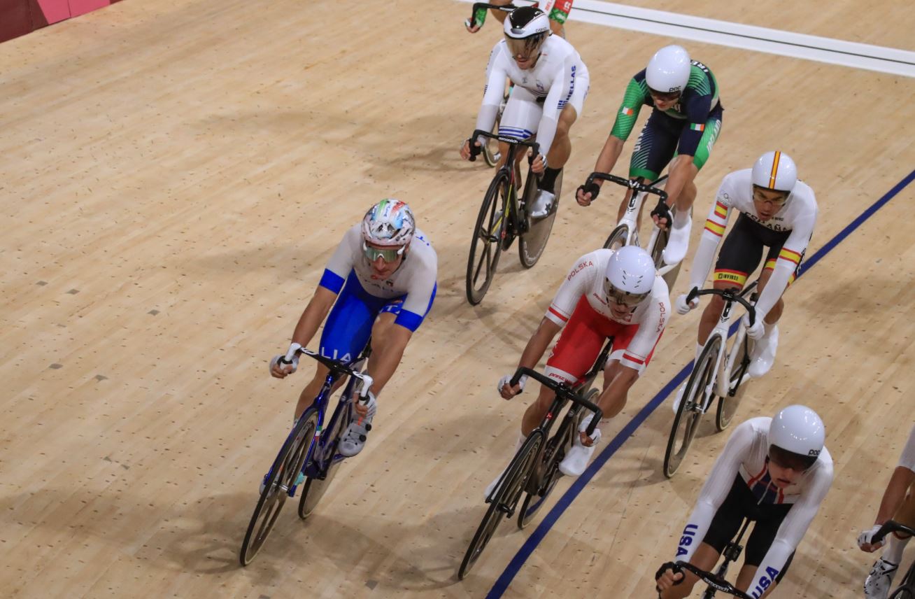 Elia Viviani in azione nella prova Omnium di Tokyo 2020