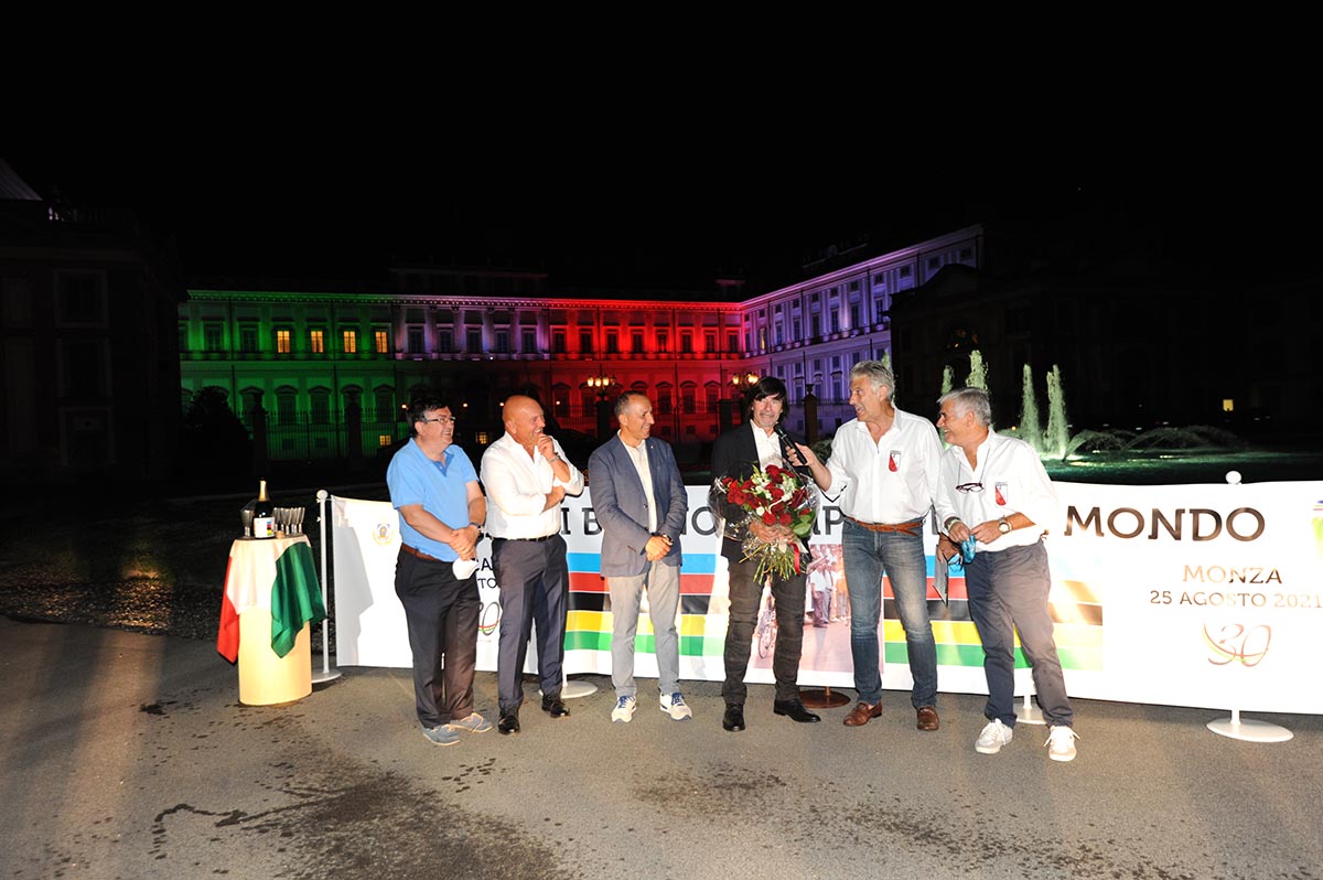 MONZA (MB) – Esattamente 30 anni dopo la vittoria del suo primo Mondiale a Stoccarda, nella serata di mercoledì 25 agosto 2021, la Villa Reale si è tinta di tricolore e Monza ha celebrato il suo campione Gianni Bugno (foto Diego Zanetti).