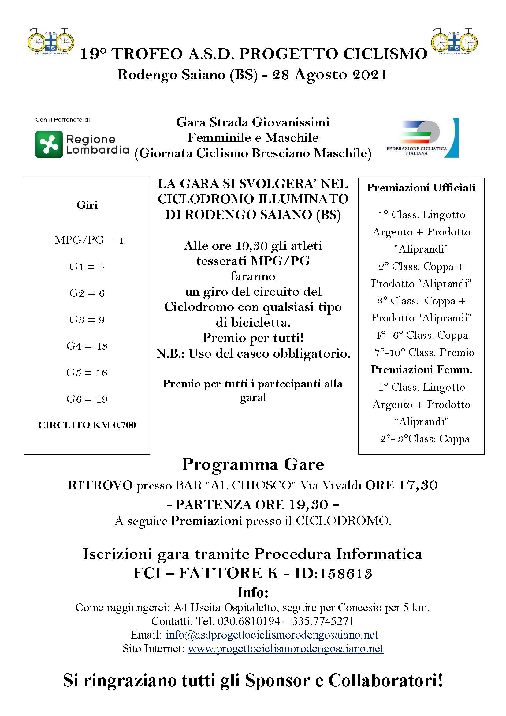 Ritrovo: Ciclodromo – “Bar al Chiosco” Via Vivaldi, snc – Rodengo Saiano (BS) H:17:30