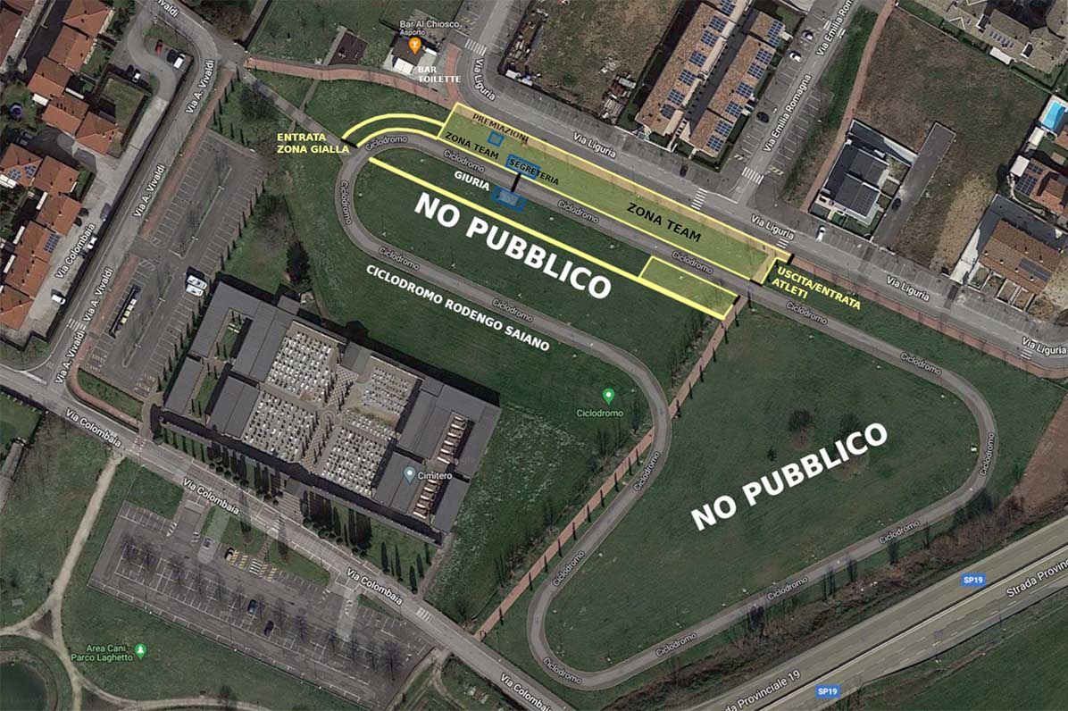 Essendo la manifestazione organizzata all’interno di un impianto sportivo, in osservanza alle nuove disposizioni in tema di normativa anti Covid-19 e in base a quanto concordato con il Commissario Straordinario e con la Polizia Locale del comune di Rodengo Saiano, in osservanza anche dei protocolli FCI, l’accesso del pubblico al ciclodromo sarà limitato. Vi proponiamo qui sotto una mappa esemplificativa delle zone.