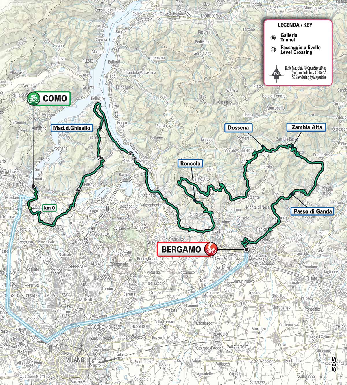 Partenza da Como in direzione Cantù. Si scala il Ghisallo come prima asperità, ma dal versante Asso per scendere su Bellagio e raggiungere Lecco lungo la riva del Lago di Como. Entrati in provincia di Bergamo inizia un continuo succedersi di salite e discese quasi senza tratti pianeggianti tra una e l’altra. Si scala per prima la Roncola (Valico di Valpiana, pendenze fino al 17%). Seguono le salite di Berbenno, Dossena, Zambla Alta e Passo di Ganda che portano il dislivello complessivo sopra i 4400 m. Da Ganda si arriva a Selvino dove inizia la classica lunga discesa ritmata da 19 tornanti. Ci sono qui 9 km di avvicinamento alla città (gli unici pianeggianti di tutto il finale) e il classico passaggio della Città Alta fino all’arrivo.