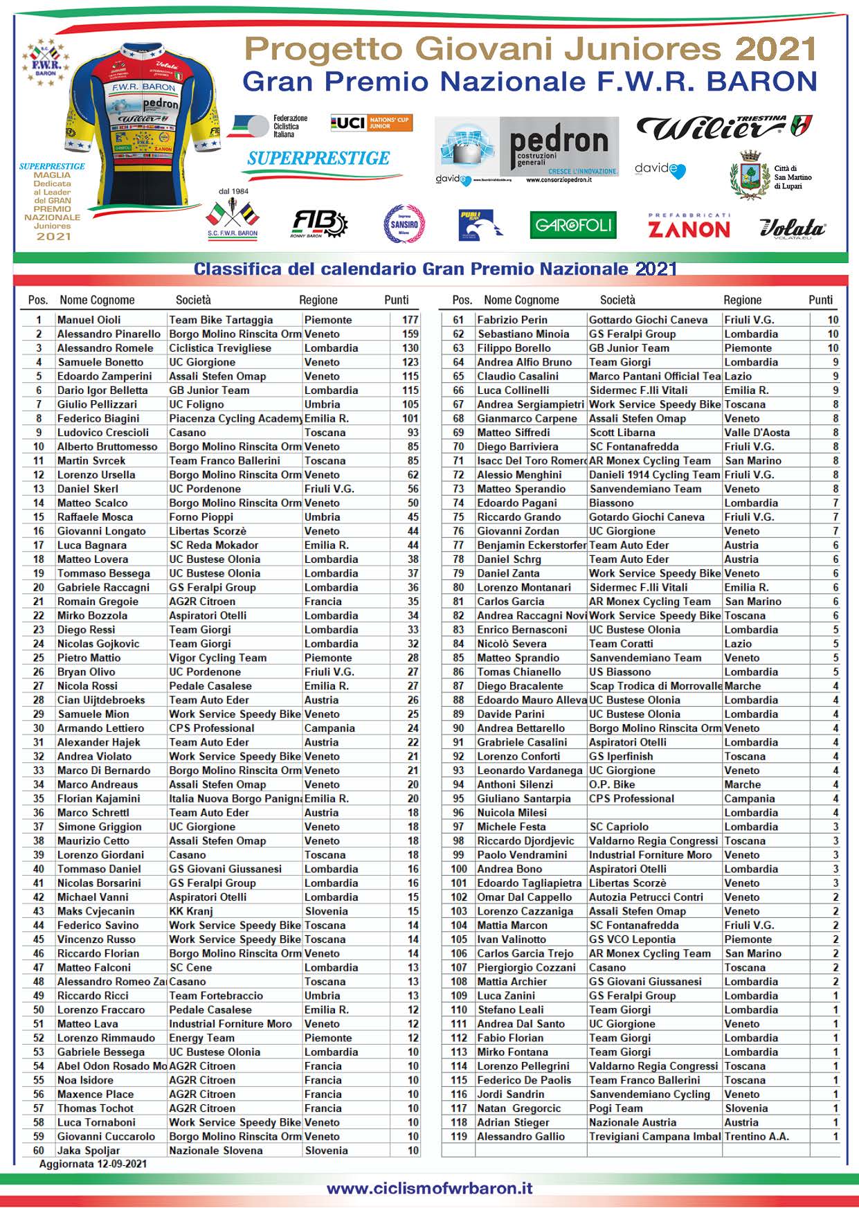 Come è noto il corridore piemontese era risultato il migliore tra gli italiani piazzandosi al 5° posto agli Europei su strada. Oioli fino ad ora ha collezionato 5 vittorie, 7 secondi e 3 terzi piazzamenti. Ad inseguirlo nel Superprestige F.W.R. Baron il trevigiano Alessandro Pinarello (Borgo Molino Rinascita Ormelle) che grazie al successo ottenuto nel 52° Trofeo Buffoni, svoltosi domenica 12 settembre in Toscana, dalla 4^ posizione (114) è passato alla 2^ con 159; il lombardo Alessandro Romele (Ciclistica Trevigliese) dalla 2^ (130) in 3^ con 136; l’altro trevigiano Samuele Bonetto (Giorgione) dalla 7^ (95) è risalito alla 4^ con 123 ed il veronese Edoardo Zamperini (Assali Stefen Omap) dalla 3^ (115) è sceso in 5^ mantenendo l’identico punteggio.