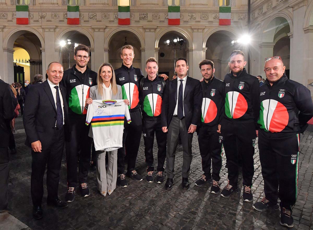 Al premier è stata regalata una bici da corsa Pinarello direttamente dalle mani del quartetto d’oro nell’inseguimento a squadre su pista, oltre alla maglia iridata appena conquistata in Belgio da Filippo Ganna.