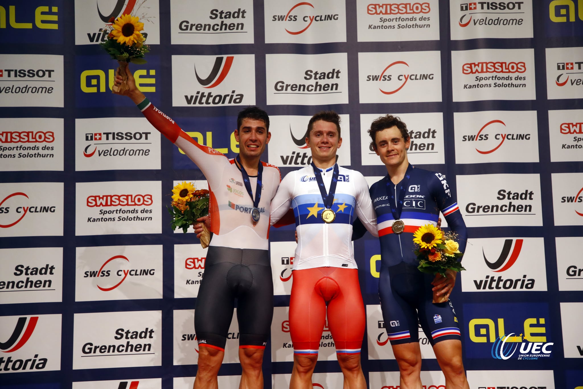 Il podio del Campionato Europeo Eliminazione maschile a Grenchen vinta da Sergey Rostovtsev
