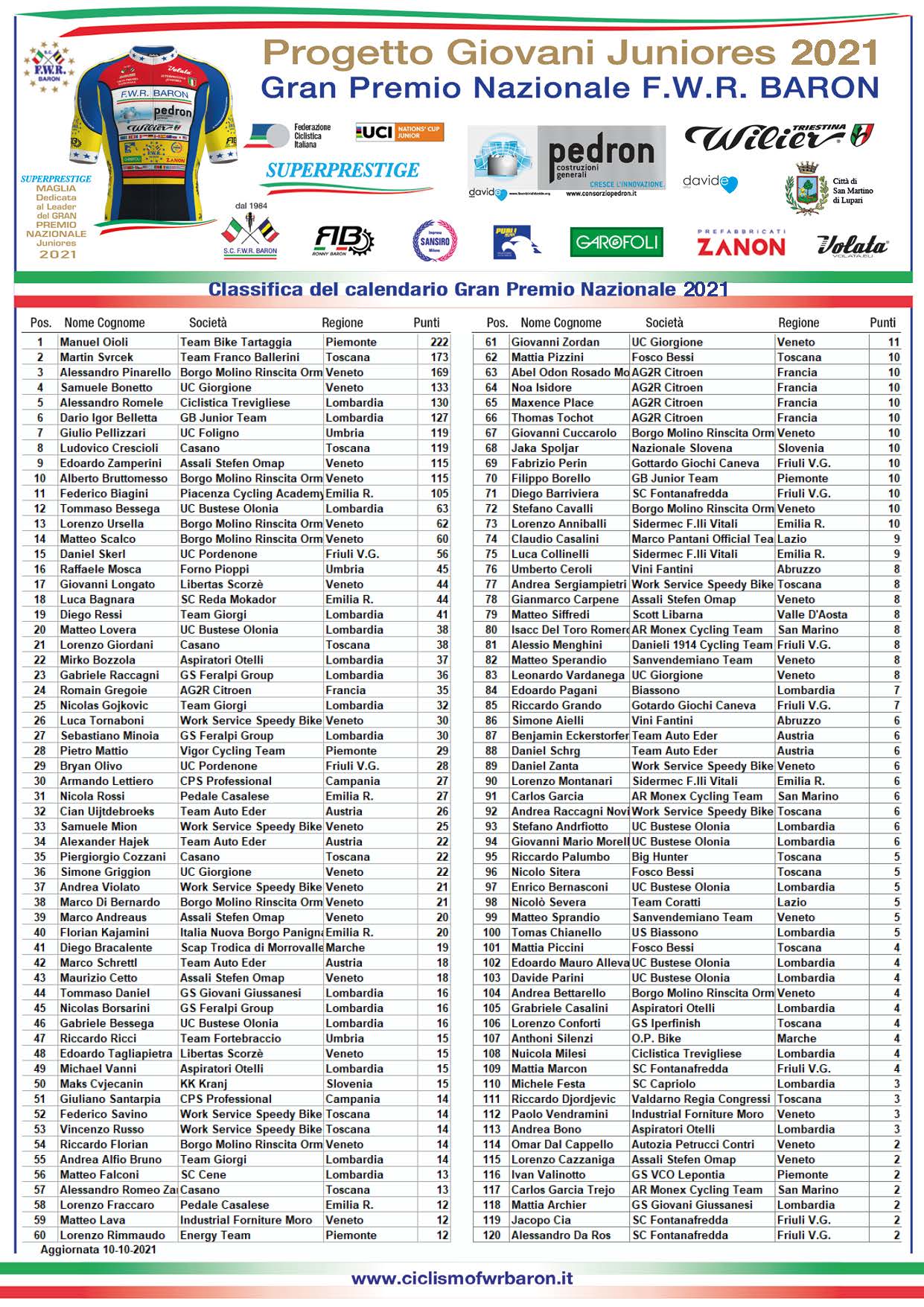 Per quanto riguarda la classifica, il piemontese Manuel Oioli della Us Bustese Olonia Team Bike Tartaggia, al termine di una lunga stagione, con 222 punti, ha preceduto lo slovacco Martin Svrcek (Team Franco Ballerini), secondo con 173 punti, e Alessandro Pinarello (Borgo Molino Rinascita Ormelle), terzo con 169 punti. Oioli, nato a Borgomanero, è stato il migliore tra gli italiani piazzandosi al 5° posto agli Europei su strada, in stagione ha collezionato sei successi, a cui si aggiungono 7 secondi e 3 terzi.