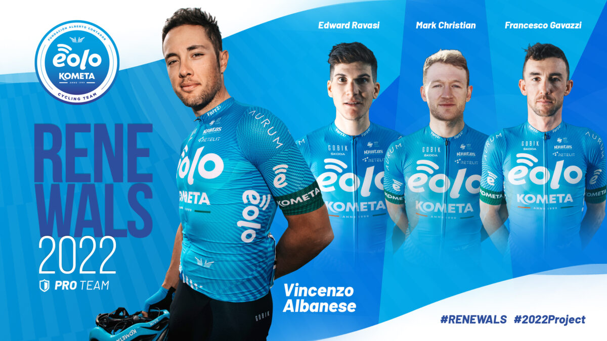 Il portoghese Daniel Viegas, gli ungheresi Erik Fetter e Márton Dina, gli italiani Davide Bais, Alessandro Fancellu e Samuele Rivi e gli spagnoli Sergio García, Arturo Grávalos, Alejandro Ropero e Diego Pablo Sevilla sono i dieci ciclisti che avevano firmato per due stagioni e affronteranno quindi il 2022 nella Eolo-Kometa Cycling Team.