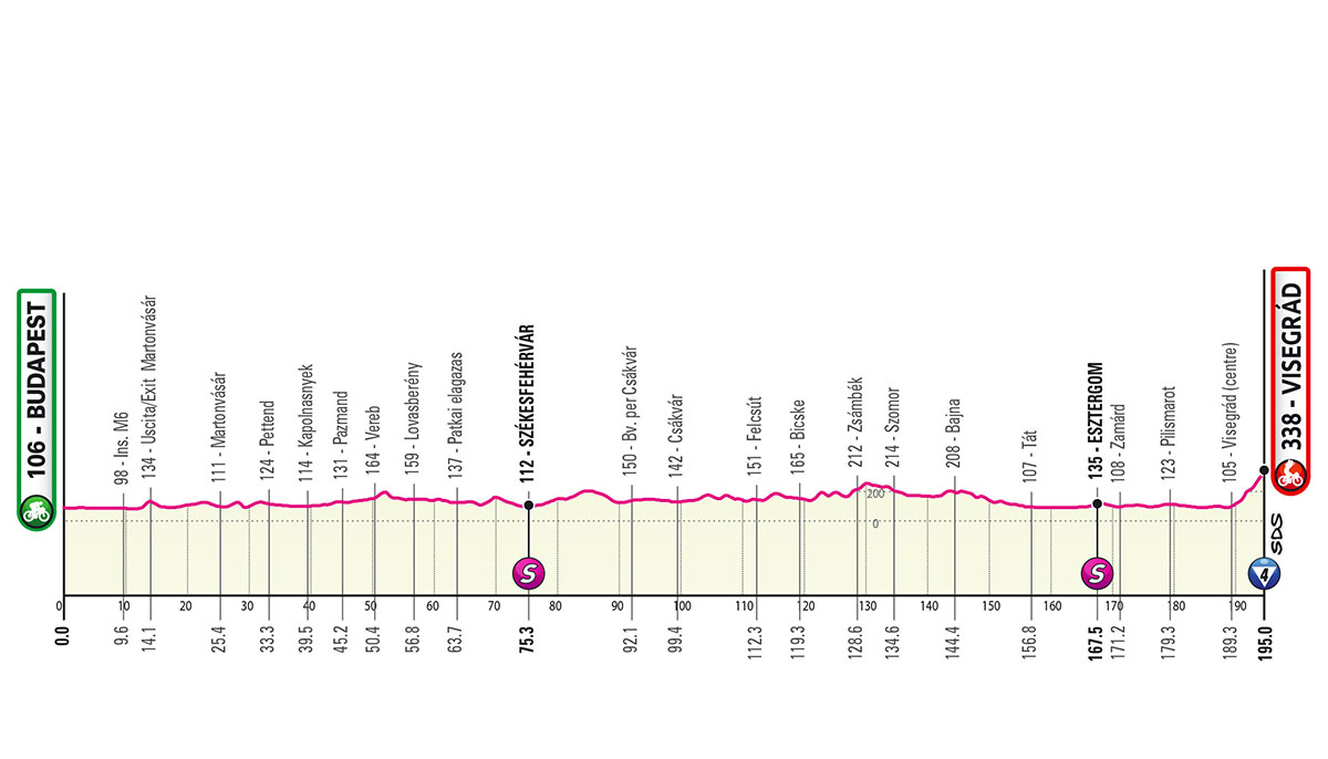 Tappa lievemente ondulata attraverso la pianura a nord della capitale fino a costeggiare il confine slovacco segnato dal Danubio presenza imponente e costante in questa zona. Si toccano alcune località di prestigio come Székesfehérvár ed Esztergom con la sua imponente basilica. Finale impegnativo una volta lasciata la riva del Danubio. Dal centro di Visegrád di sale per circa 5 km al 5% fino al castello reale dove verrà assegnata la prima Maglia Rosa al termine di una volata sempre più ristretta.