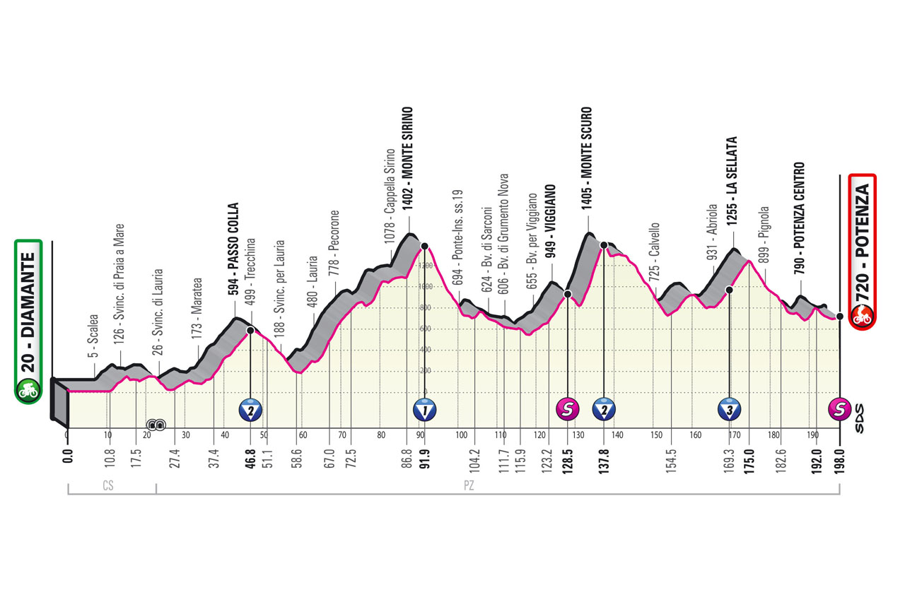 Tappa molto mossa attraverso le montagne calabro-lucane con un dislivello complessivo degno di una tappa Dolomitica. L’avvio lungo il mare costituisce l’unica parte pianeggiante o quasi. Dopo Maratea la sequenza di asperità, più o meno impegnative, è ininterrotta. Si scala il passo della Colla che porta a Lauria dove si affronta il Monte Sirino, vecchia conoscenza del Giro che lo ritrova dopo 23 anni. Dopo l’attraversamento di Viggiano si scala la Montagna grande di Viggiano, salita inedita molto impegnativa per giungere a Potenza dopo l’ultima salita della Sellata.