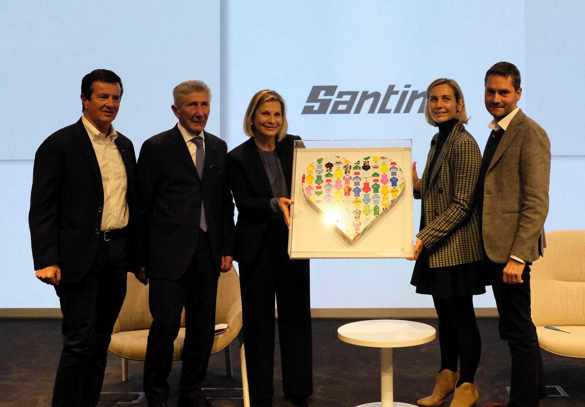 «Sin dagli anni 70, Santini è stata vicina al mondo dell’agonismo di vertice, ancor’oggi per noi il laboratorio dove studiare soluzioni che poi decliniamo anche nelle collezioni per gli amatori – prosegue Monica Santini – e le partnership che abbiamo instaurato confermano le nostre scelte strategiche». Infatti, oltre allo storico rapporto con l’UCI, la federazione mondiale di ciclismo e che dura dal 1988, l’azienda orobica può vantare 25 edizioni di Maglia Rosa, l’accordo esclusivo con IRONMAN (il più importante circuito di triathlon), la sponsorizzazione del Team Trek Segafredo e, ultimo ma non certo per importanza, l’annuncio della partnership con il Tour de France: «Dal 2022 e per cinque edizioni vestiremo la maglia gialla del Tour de France: questo rappresenta un traguardo eccezionale e devo ringraziare le mie figlie per avermi fatto un ‘regalo’ simile…» ha commentato un emozionato Pietro Santini.