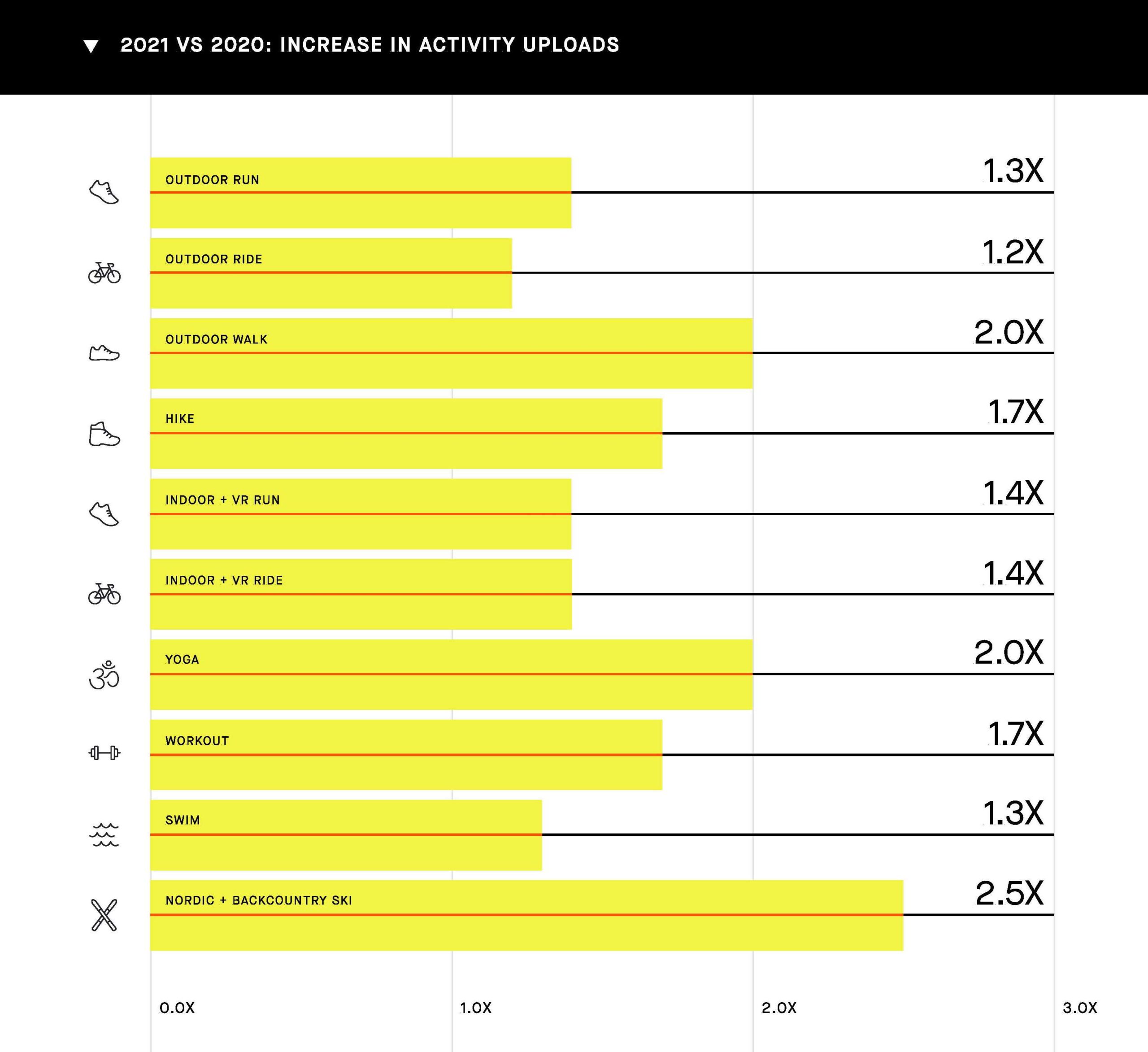 - Tutti i tipi di sport hanno registrato una forte crescita in tutto il mondo. Le passeggiate (x2) e le escursioni (x1,7) hanno visto il più grande aumento nel 2021, insieme allo yoga (x2) e ad altri allenamenti al chiuso.