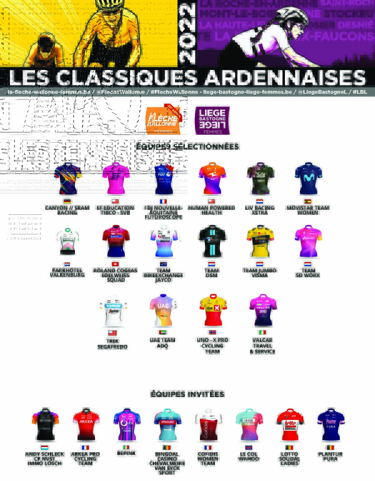Per la Freccia Vallone e la Liegi Femminili sono state selezionate Canyon // Sram racing, EF Education Tibco – SVB, FDJ Nouvelle Aquitaine Futuroscope, Human Pwered Health, Liv Racing Xstra, Movistar Team Women, Prhotel Valkenburg, Roland Cogeas Edelweiss Squad, Time BikeExchange Jayco, Tam DSM, Team Jumbo Visma, Team SD Worx, Trek Segafredo, UAE Team ADQ, Uno-X Pro Cycling Team e Valcar Travel & Service.