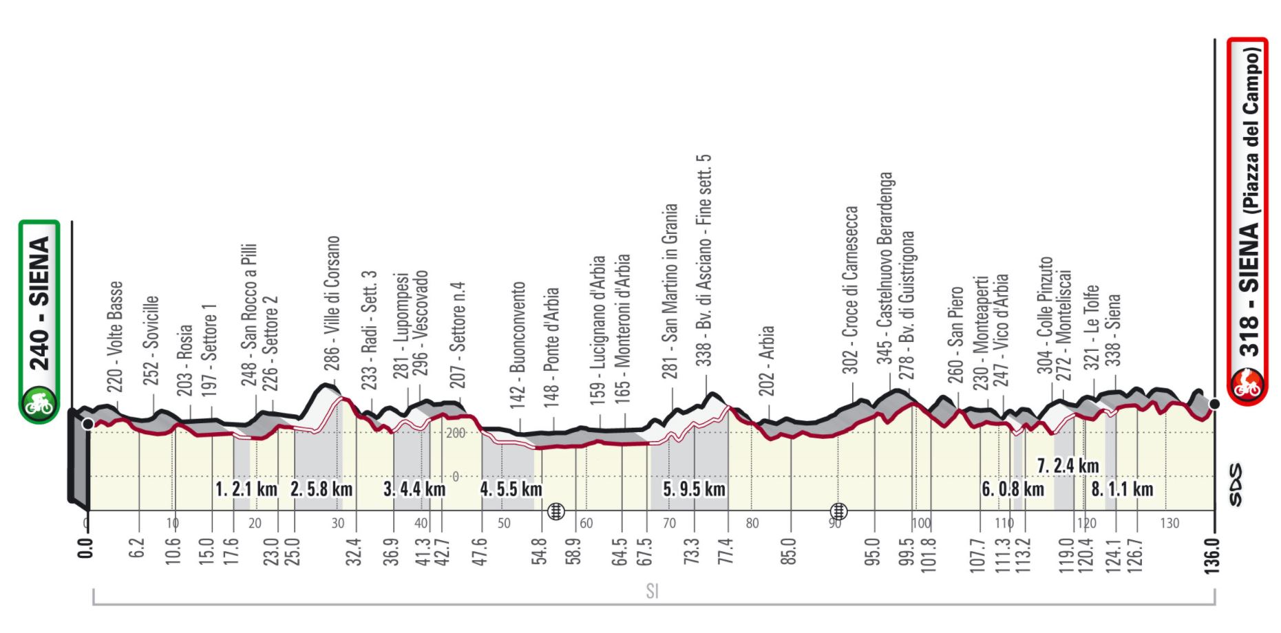Gli ultimi km si snodano per la prima parte all’esterno dell’abitato di Siena su strade larghe e lunghi rettifili collegati tra loro da ampie curve, prima in discesa e poi in leggera salita fino ai 2 km dall’arrivo dove viene imboccata la via Esterna di Fontebranda con pendenze fino al 9%. A 900 m dall’arrivo si supera la Porta di Fontebranda e inizia la pavimentazione lastricata. La pendenza supera il 10% fino a raggiungere attorno ai 500 m dall’arrivo, in via Santa Caterina, punte del 16%. Segue una svolta decisa a destra nella via delle Terme e l’immissione in via Banchi di Sotto. Dai 300 m la strada è sempre in leggera discesa. Ai 150 m svolta a destra in via Rinaldini. Ai 70 m si entra nel Campo, ultimi 30 in discesa al 7%, traguardo pianeggiante.