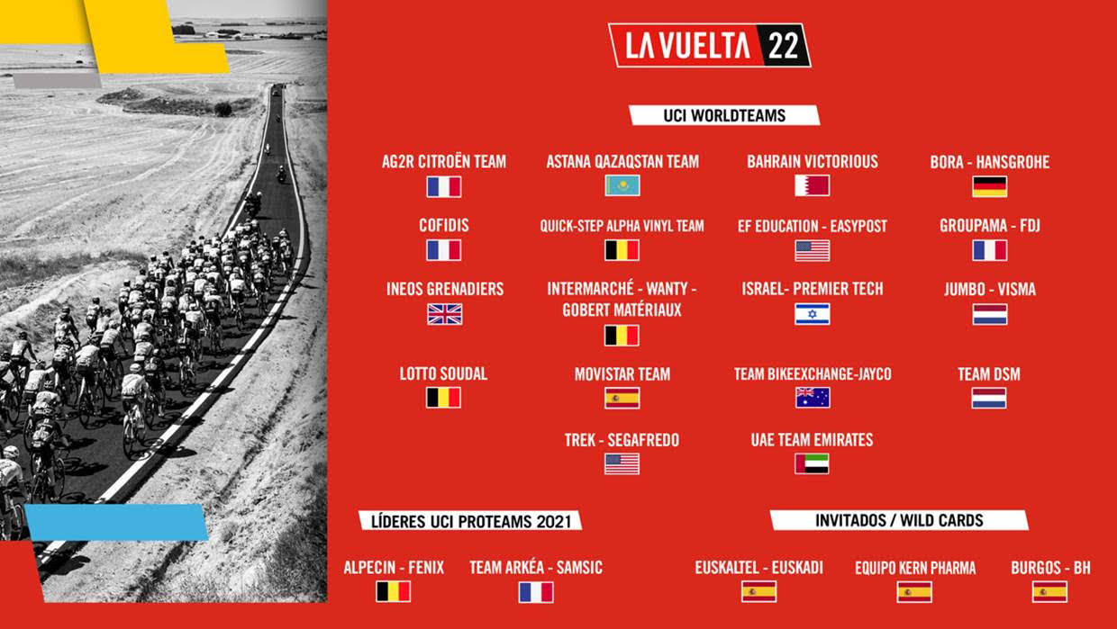 Inoltre, Alpecin-Fenix (BEL) e Arkéa-Samsic (FRA), leader nella classifica dell’UCI ProTeams 2021 parteciperanno di diritto a La Vuelta 22.